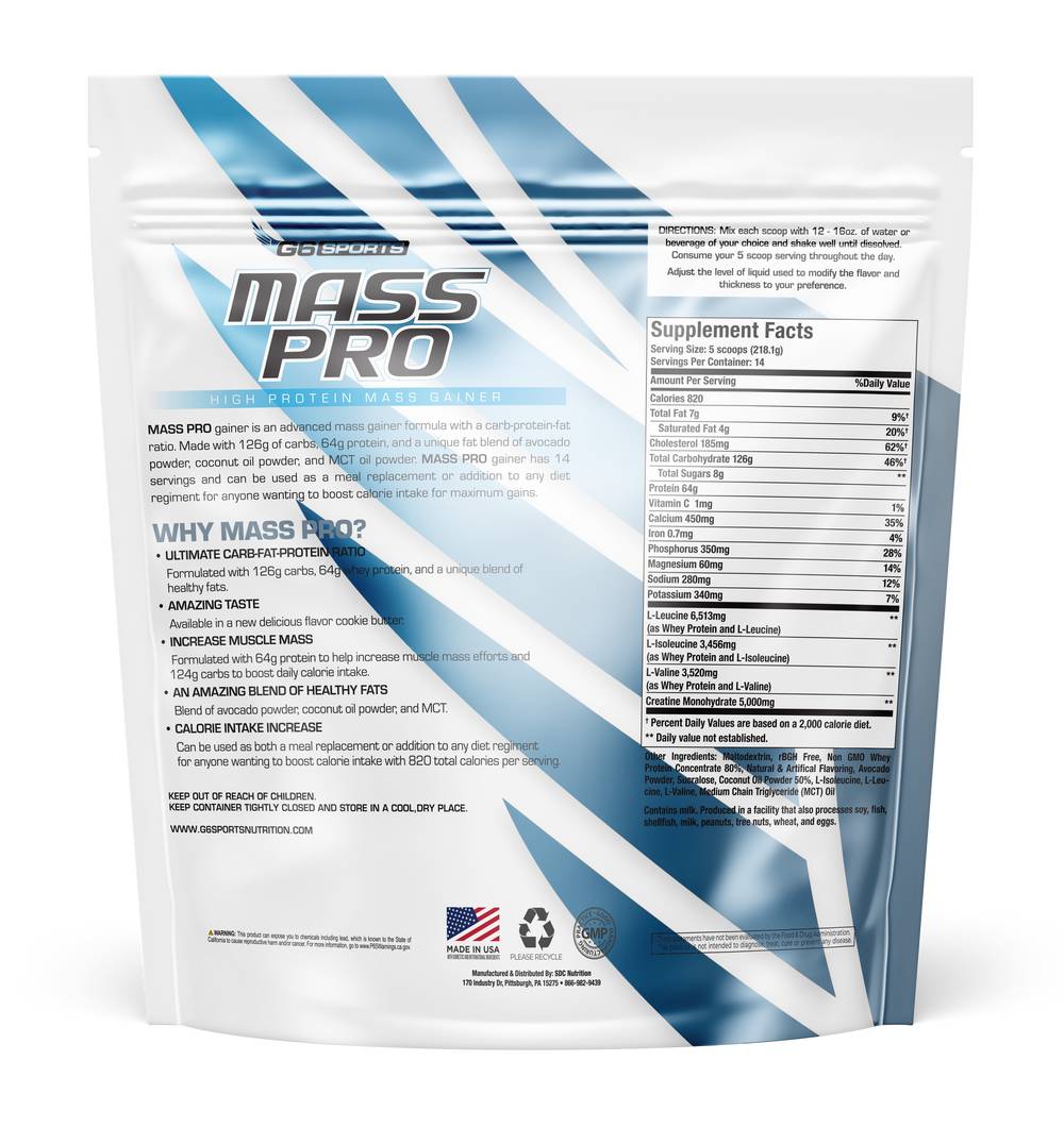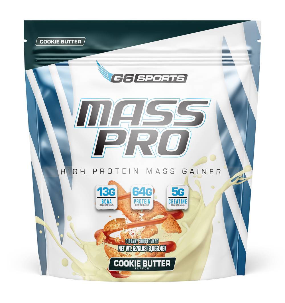 G6 Sports - Mass Pro High Protein Mass Gainer - Cookie Butter - 14 Servings • Formulated with 126g carbs, 64g whey protein, and a unique blend of healthy fats. • Available in a new delicious flavor cookie butter. • Formulated with 64g protein to help increase muscle mass efforts and 124g carbs to boost daily calorie intake. • Blend of avocado powder, coconut oil powder, and MCT. • Can be used as both a meal replacement or addition to any diet regimen for anyone wanting to boost calorie intake with 820 total calories per serving. • 13g BCAA • 5g Creatine • Color: Cookie butter • Size: 1 • Packaging: Reusable