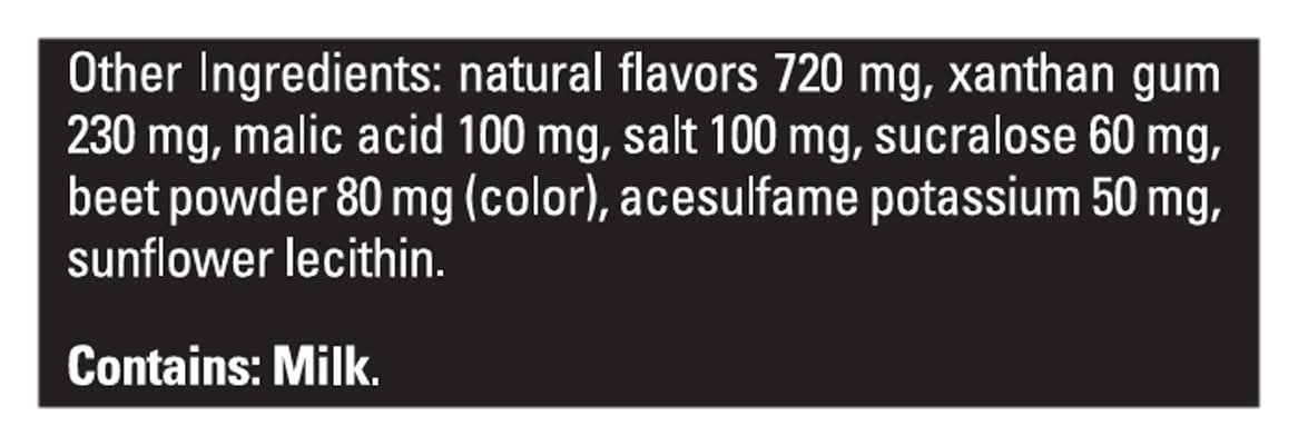 Ingredients: Other Ingredients: Natural Flavors 720 mg, Xanthan Gum 230 mg, Malic Acid 100 mg, Salt 100 mg, Sucralose 60 mg, Beet Powder 80 mg (Color), Acesulfame Potassium 50 mg, Sunflower Lecithin Contains: Milk, Tree Nuts, Soybeans