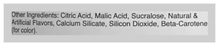 Ingredients: Other Ingredients: Citric Acid, Malic Acid, Sucralose, Natural & Artificial Flavors, Calcium Silicate, Silicon Dioxide, Beta-Carotene (for Color)