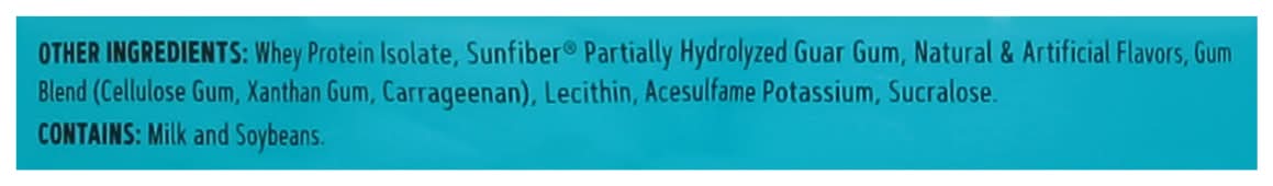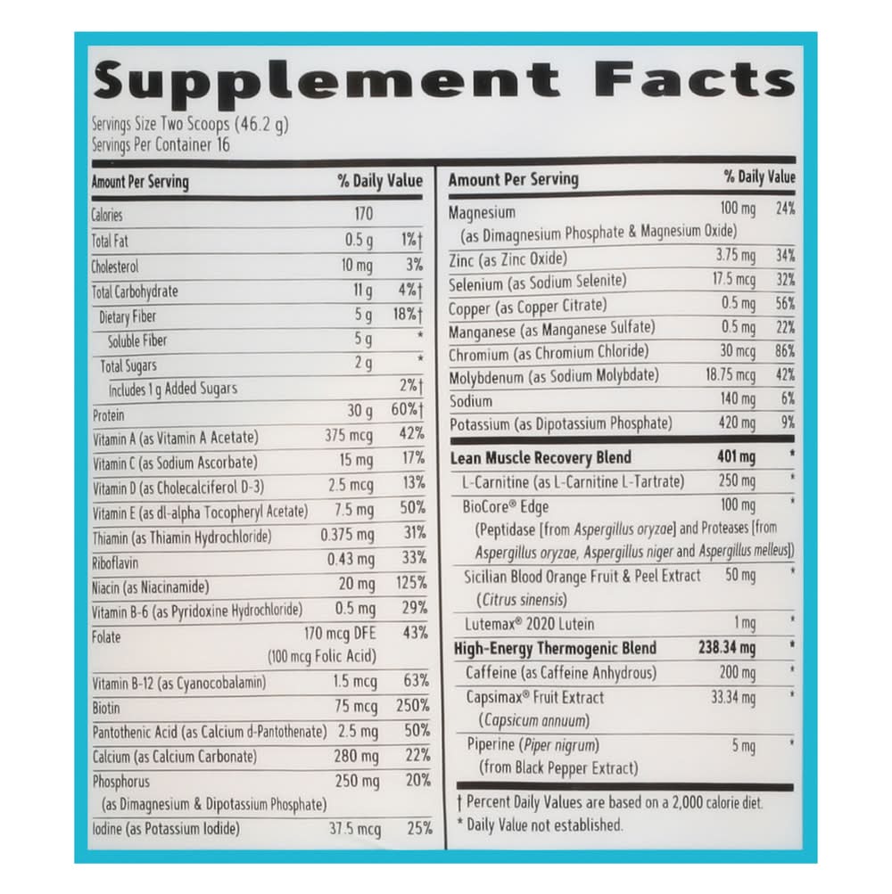 Ingredients: Other Ingredients: Whey Protein Isolate, Sunfiber Partially Hydrolyzed Guar Gum, Natural & Artificial Flavors, Gum Blend (Cellulose Gum, Xanthan Gum, Carrageenan), Lecithin, Acesulfame Potassium, Sucralose. Lean Muscle Recovery Blend: L-Carnitine (as L-Carnitine L-Tartrate), Biocare Edge: (Peptidase [from Aspergillus Oryzae] and Proteases [from Aspergillus Oryzae Aspergillus Niger and Aspergillus Melleus]), Sicilian Blood Orange Fruit & Peel Extract (Citrus Sinensis), Lutemax 2020 Lutein. High-Energy Thermogenic Blend: Caffeine (as Caffeine Anhydrous), Capsimax Fruit Extract (Capsicum Annuum), Piperine (Piper Nigrum) (from Black Pepper Extract) Contains: Milk, Soybeans