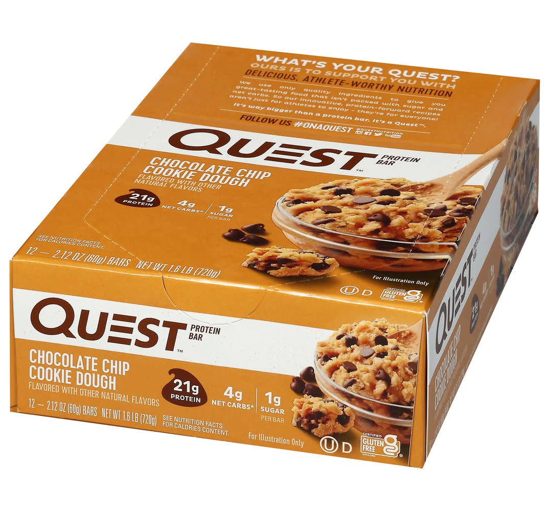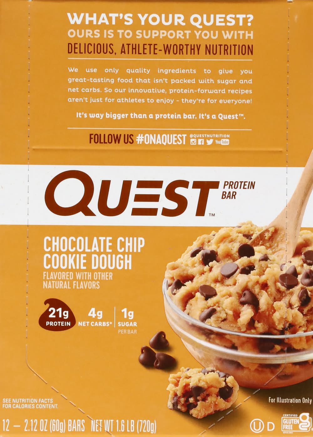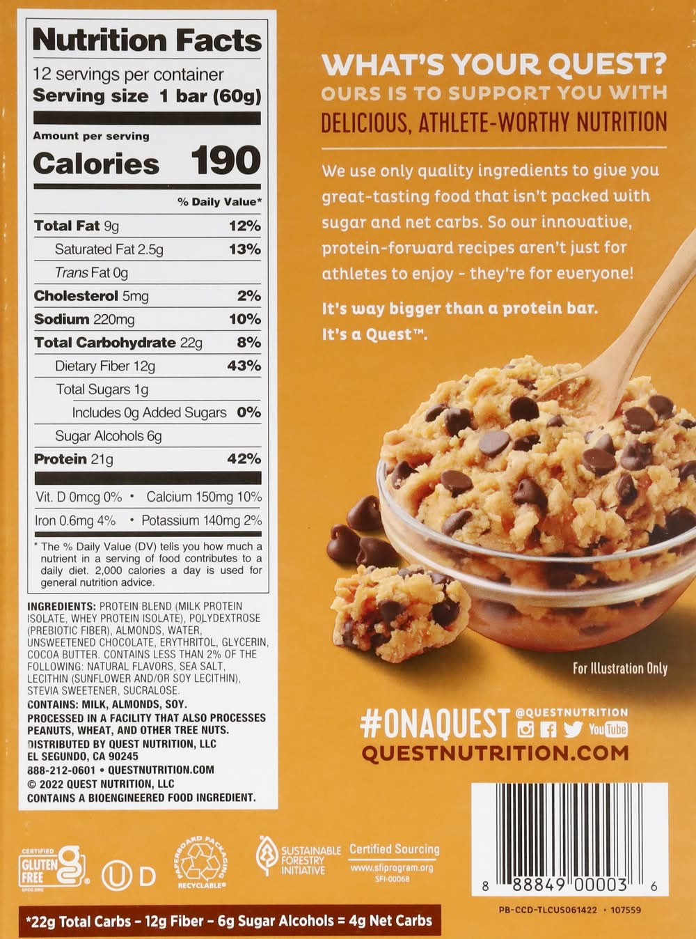 Quest Nutrition is on a mission to provide the foods you crave work for you not against you. That's why we only use complete-dairy based proteins to provide your body with all nine essential amino acids it needs. We use custom recipes to create our own chocolate flavored chips, cookie pieces and other inclusions to make every bit as delicious as your cravings. Benefits: • 21g Protein Bar • 1g Sugar • 5g Net Carbs* • 15g Fiber Per Serving • Certified Gluten-Free • Kosher • Contains 12 Chocolate Chip Cookie Dough Flavored Quest Protein Bars! • Flavor: Chocolate chip cookie dough • Pack size: 12 • Size: 1 • Number of servings: 12 • Quest Nutrition, El Segundo, CA, 90245