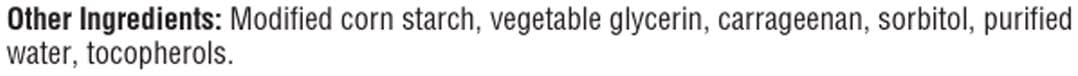 Ingredients: Other Ingredients: Modified Corn Starch, Vegetable Glycerin, Carrageenan, Sorbitol, Purified Water, Tocopherols Contains: Corn
