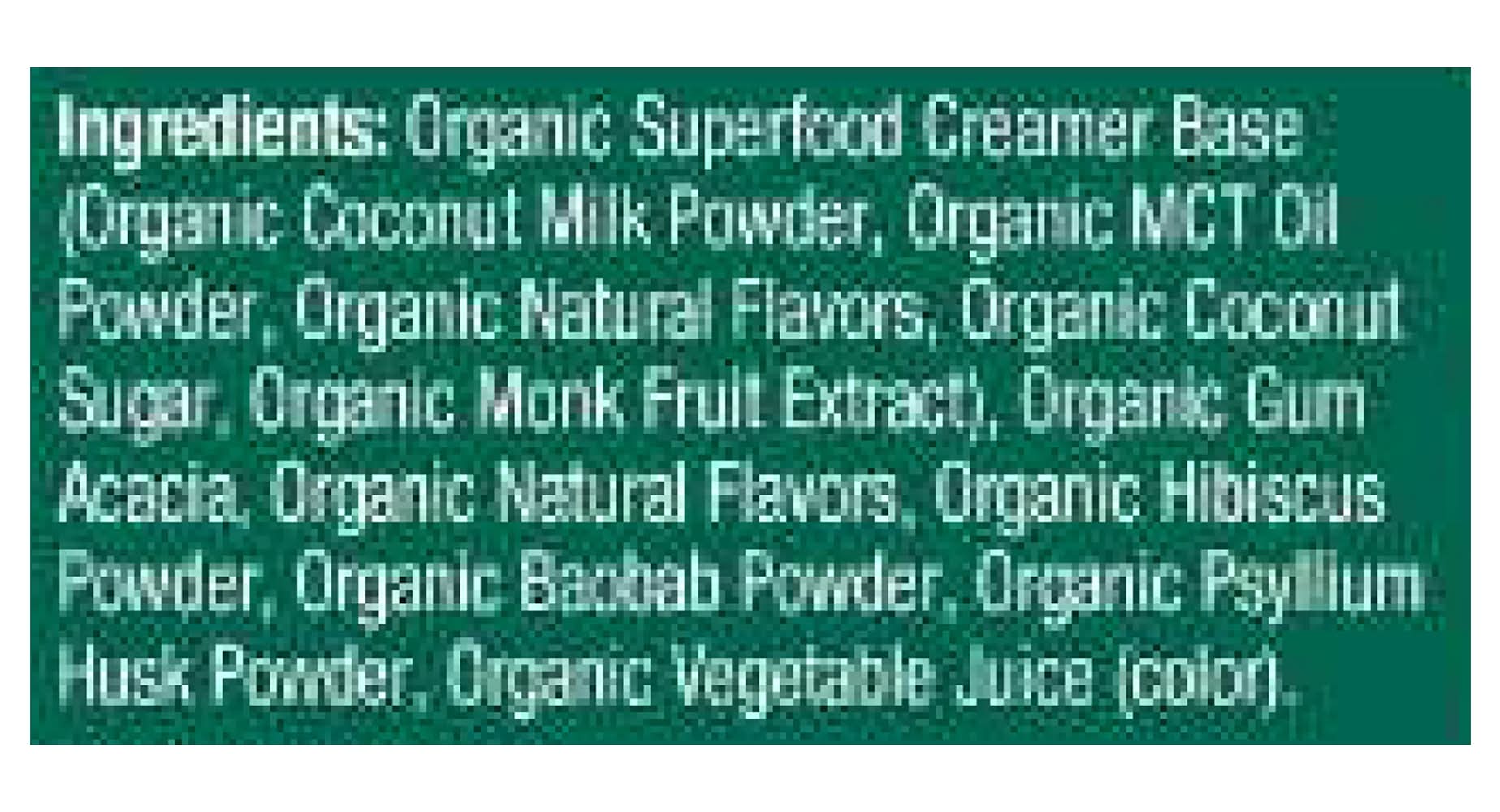 Ingredients: Organic Superfood Creamer Base (Organic Coconut Milk Powder, Organic MCT Oil Powder, Organic Natural Flavors, Organic Coconut Sugar, Organic Monk Fruit Extract), Organic Gum Acacia, Organic Natural Flavors, Organic Hibiscus Powder, Organic Baobab Powder, Organic Psyllium Husk Powder, Organic Vegetable Juice (Color) Contains: Milk, Peanuts, Tree Nuts, Milk