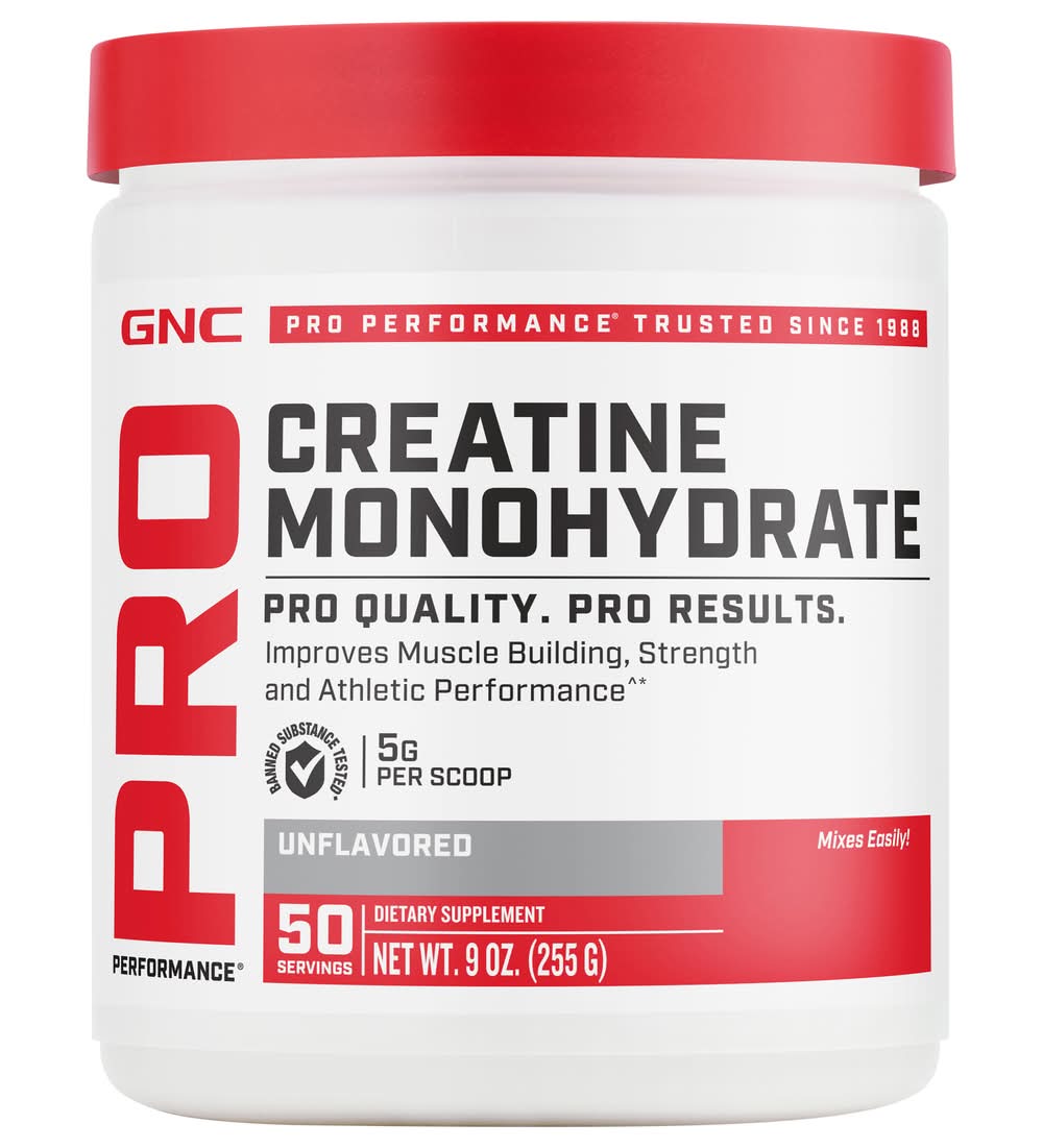 • CREATINE HELPS FUEL NEXT-LEVEL RESULTS: GNC Pro Performance Creatine Monohydrate is manufactured to ensure purity, potency, and freshness—and it’s unflavored, so it blends easily with water or your favorite sports drink. • IMPROVE ATHLETIC PERFORMANCE: Over the past several years, numerous studies have shown that creatine supplementation may help improve athletic performance. • FUEL MUSCLES: In the body, creatine is converted to creatine phosphate which helps fuel skeletal muscles—the ones you use in the gym. • SUPPORT ENERGY FOR INTENSE WORKOUTS: Creatine provides support for immediate energy production during high-intensity exercise. • MAX OUT MUSCLE CREATINE STORES: After one month of supplementation with GNC Pro Performance Creatine Monohydrate, muscles will have the maximum amount of creatine stored and available for training. Size: 1