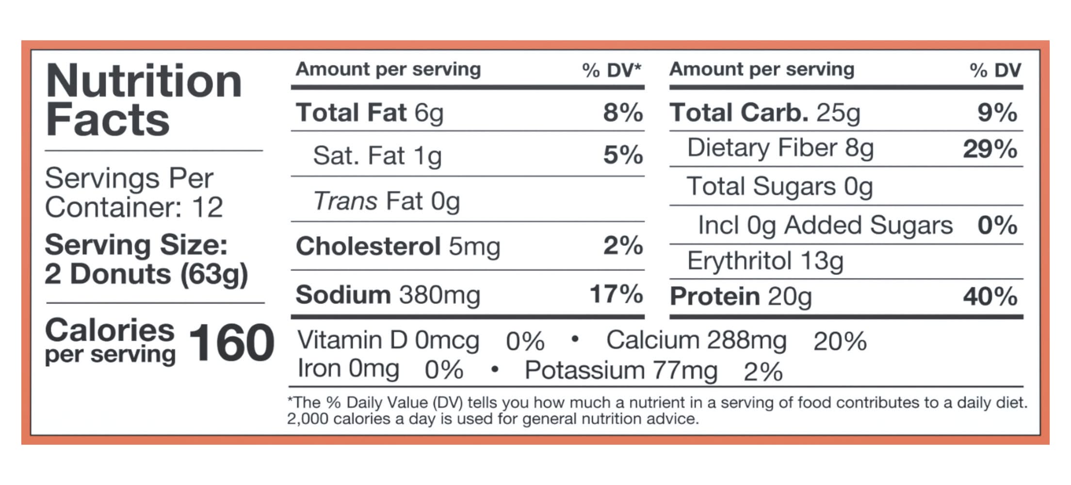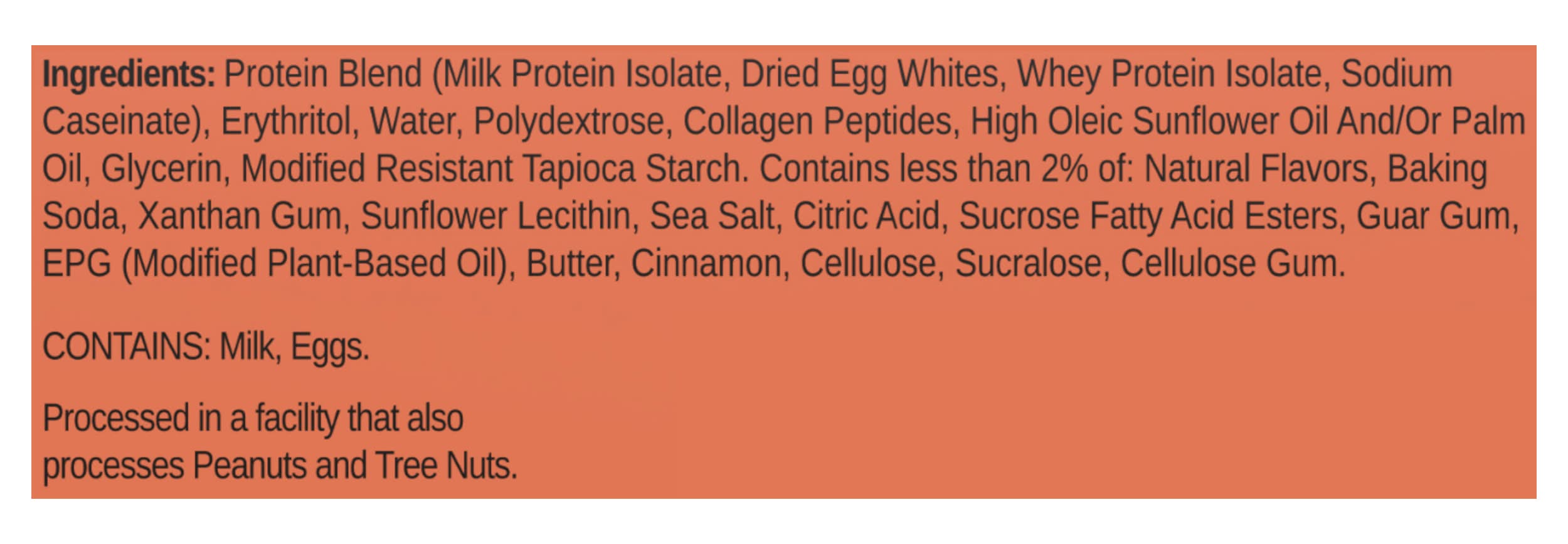 Ingredients: Protein Blend (Milk Protein Isolate, Dried Egg Whites, Whey Protein Isolate, Sodium Caseinate), Erythritol, Water, Polydextrose, Collagen Peptides, High Oleic Sunflower Oil and/or Palm Oil, Glycerin, Modified Resistant Tapioca Starch, Contains Less than 2% of: Natural Flavors, Baking Soda, Xanthan Gum, Sunflower Lecithin, Sea Salt, Citric Acid, Sucrose Fatty Acid Esters, Guar Gum, Epg (Modified Plant-Based Oil), Butter, Cinnamon, Cellulose, Sucralose, Cellulose Gum Contains: Milk, Eggs, Peanuts, Tree Nuts