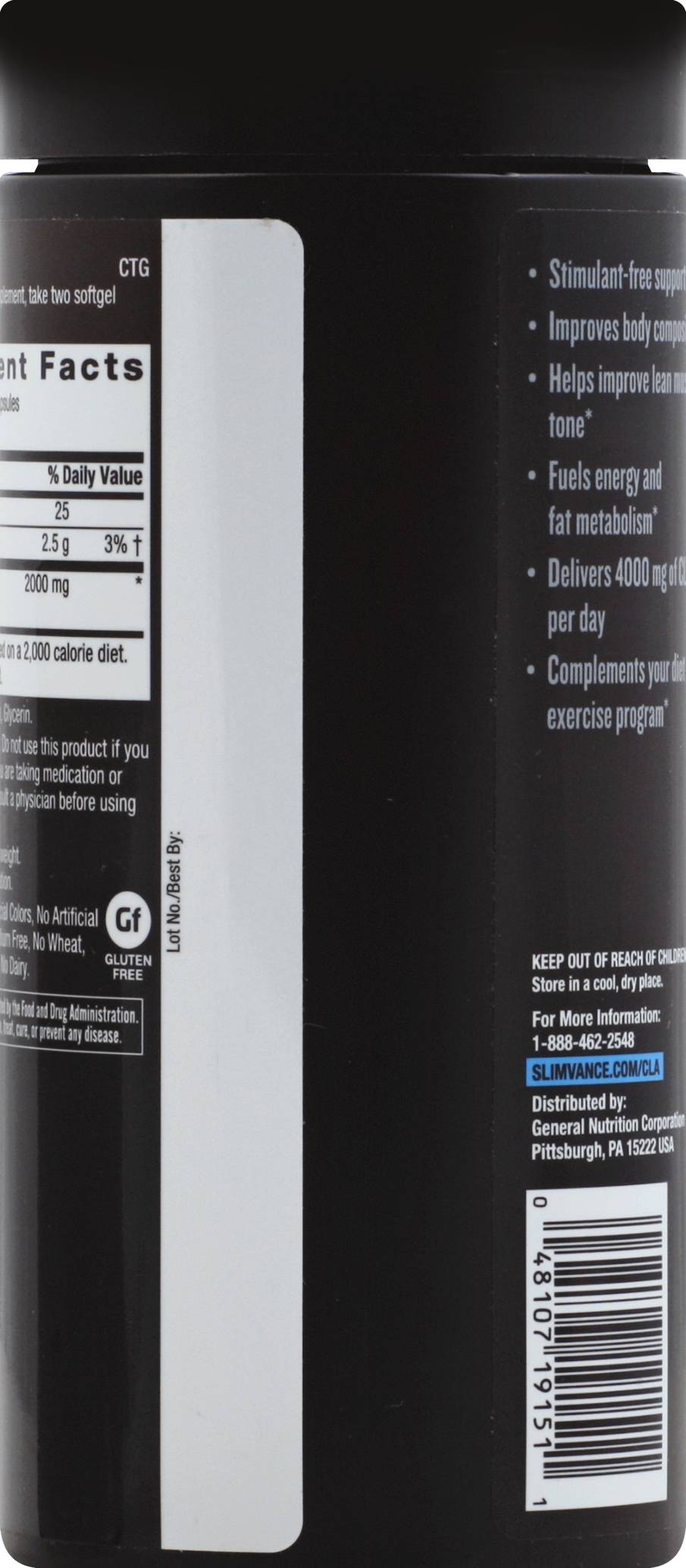 Dietary Supplement. 30-day Supply. Improves body composition. Fuels metabolism. No sugar, no starch, no artificial colors, no artificial flavors, no preservatives, sodium free, no wheat, gluten free, no corn, no soy, no dairy. Stimulant-free support. Improves body composition. Helps improve lean muscle tone. Fuels energy and fat metabolism. Delivers 4000 mg of CLA per day. Complement your diet and exercise program. For More Information: 1-888-462-2548 slimvance.com. (These statements have not been evaluated by the Food and Drug Administration. This product is not intended to diagnose, treat, cure, or prevent any disease.)