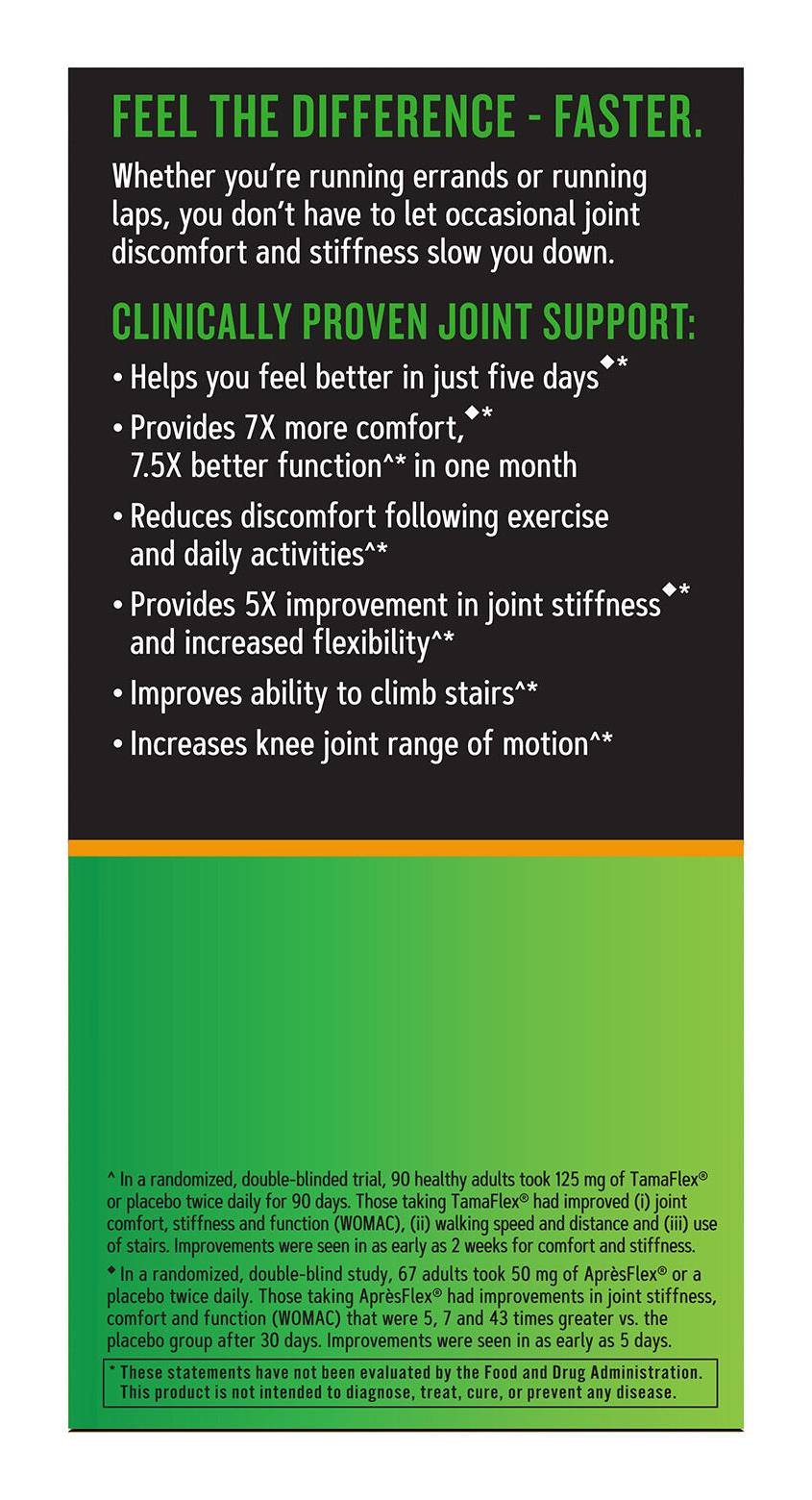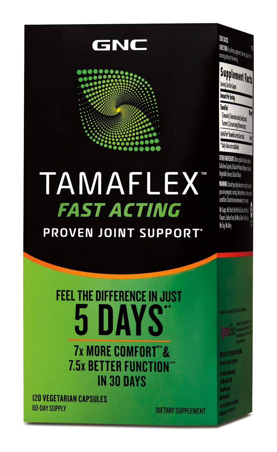 For centuries, traditional Ayurvedic preparations have used the power of turmeric and tamarind seed. Now, GNC has formulated a powerful, unique botanical blend that combines these ingredients, along with AprèsFlex® made from boswellia serrata, into just two small pills a day to give you GNC TamaFlex™ Fast Acting. TamaFlex Fast Acting represents a breakthrough in joint health and comfort proven to help you feel better and deliver results in just five days!◆* • TamaFlex Fast Acting provides 7x more joint comfort in one month◆* • TamaFlex Fast Acting provides 7.5x better joint function in one month◆* • TamaFlex Fast Acting provides 5x improvement in joint stiffness◆* and increased flexibility^* • TamaFlex Fast Acting reduces discomfort following exercise and daily activities^* • Non-GMO, vegetarian-friendly, shellfish-free and formulated without artificial colors or flavors This product is eligible for FSA and HSA plans. Restrictions may apply based on your individual insurance plan. Contact your insurance provider about plan allowances and requirements. While FSA/HSA cards cannot be accepted, please use a credit card or debit card to pay for your eligible items and then submit the receipt to your plan based on the current policies for reimbursement. ^In a randomized, double blinded trial, 90 healthy adults took 125 mg of TamaFlex or placebo twice daily for 90 days. Those taking TamaFlex had improved (i) joint comfort, stiffness and function (WOMAC), (ii) walking speed and distance, (iii) use of stairs, and (iv) range of motion in the joint. Improvements were seen as early as 2 weeks for all outcomes but joint function (as early as 1 month). ◆In a randomized, double-blind study, 67 adults took 50 mg of AprèsFlex® or a placebo twice daily. Those taking AprèsFlex® had improvements in joint stiffness, comfort and function (WOMAC) that were 5, 7 and 43 times greater vs. the placebo group after 30 days. Improvements were seen as early as 5 days. *These statements have not been evaluated by the FDA. These products are not intended to diagnose, treat, cure or prevent any disease. All products and prices may not be available at all locations. All in-stock products are available on GNC.com. Errors and omissions are not the responsibility of the advertiser. Shop one of more than 8,500 GNC stores. Call 1-800-477-4462 or visit GNC.com to find the store nearest you. Size: 1