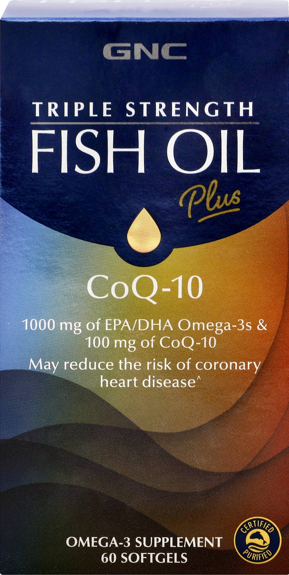 1000 mg of EPA/DHA Omega-3s & 100 mg of CoQ-10. May reduce the risk of coronary heart disease (Consumption of Omega-3 fatty acids may reduce the risk of coronary heart disease. FDA evaluated the data and determined that, although there is scientific evidence supporting the claim, the evidence is not conclusive). Omega-3 supplement. Certified purified. Our Quality Commitment to You: Since 1935, our mission as the industry leader has been to provide you with the highest-quality nutritional supplements. We continue to stand behind this mission. If you're not 100% satisfied with your purchase, return the unused portion of the product with your receipt within 30 days and we'll either refund your money or find a replacement product that is right for you. GNC Triple Strength Fish Oil Plus CoQ-10 combines two premium ingredients that support heart health. Triple Strength Fish Oil: Our Triple Strength Fish Oil is packed with Omega-3s, including EPA, which is clinically shown to support heart health. What's more, EPA supports circulatory health, as well as normal, healthy triglyceride and cholesterol levels, joint health and the body's natural anti-inflammatory response. Omega-3s also provide support for healthy vision, brain development and skin health. CoQ-10: CoQ-10 helps support heart health and a healthy cardiovascular system. Plus CoQ-10 is beneficial for those taking statin drugs (Statin drugs can reduce the amount of natural CoQ-10 within the body. Supplementing with CoQ-10 helps replenish CoQ-10 levels within the body. CoQ-10 is not a statin replacement and does not lower cholesterol. Consult your doctor before discontinuing any medications when taking CoQ-10). Potency verified by GNC procedure No. 5123. Conforms to USP less than 2091 greater than for weight. Enteric coated to help control fishy burps - guaranteed. Free from detectable levels of mercury, lead, heavy metals and PCBs. From wild, deep ocean fish. For More Information: 1-888-462-2548. Shop now (at) gnc.com. No sugar, no starch, no artificial flavors, no preservatives, no wheat, gluten free, no corn, no dairy. Please recycle this box. (These statements have not been evaluated by the Food and Drug Administration, This product is not intended to diagnose, treat, cure, or prevent any disease.) • General Nutrition Corporation, Pittsburgh, PA, 15222, Ph: 888-462-2548 • Packaging: Reusable