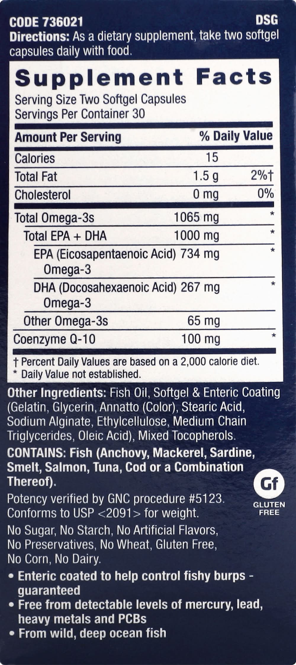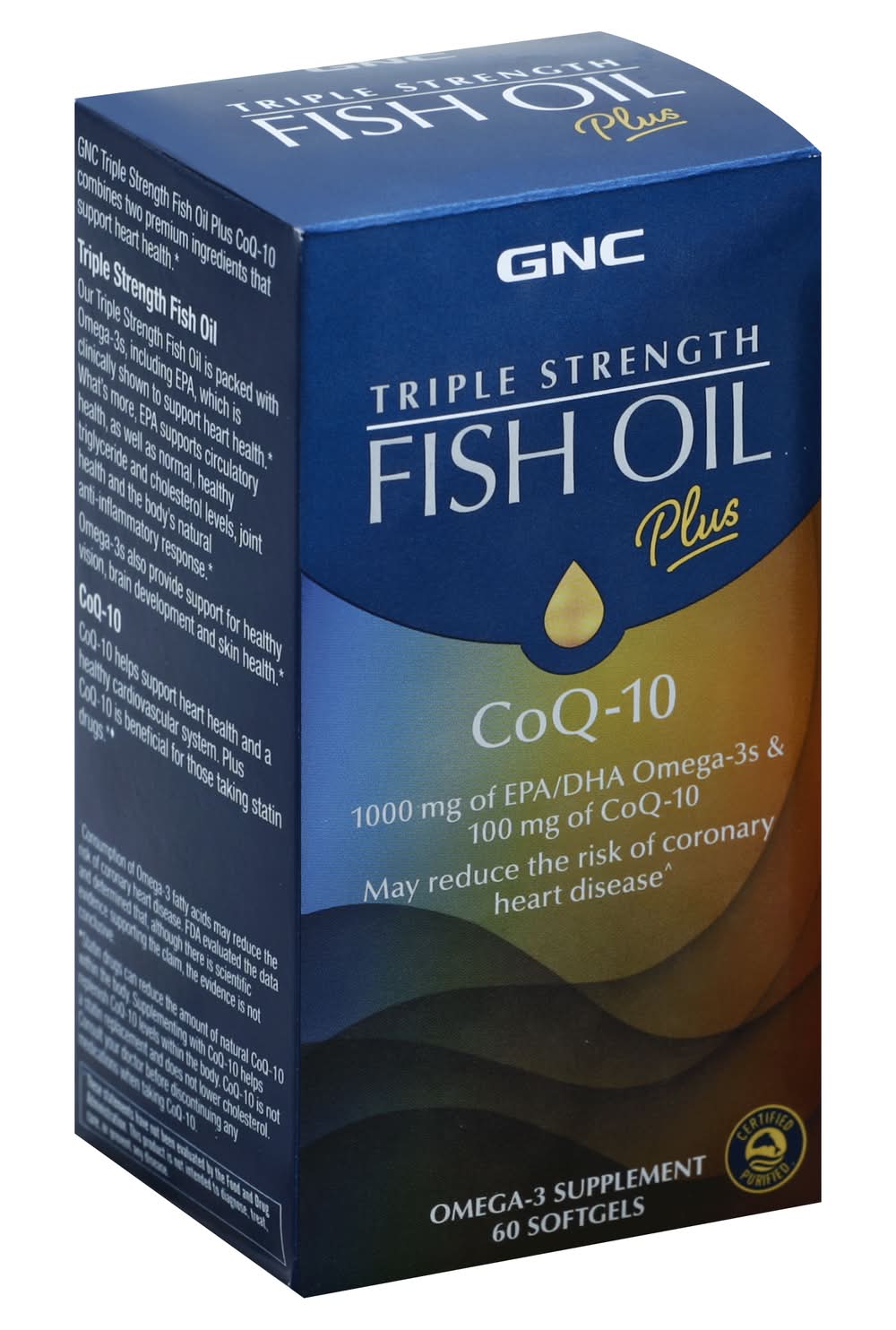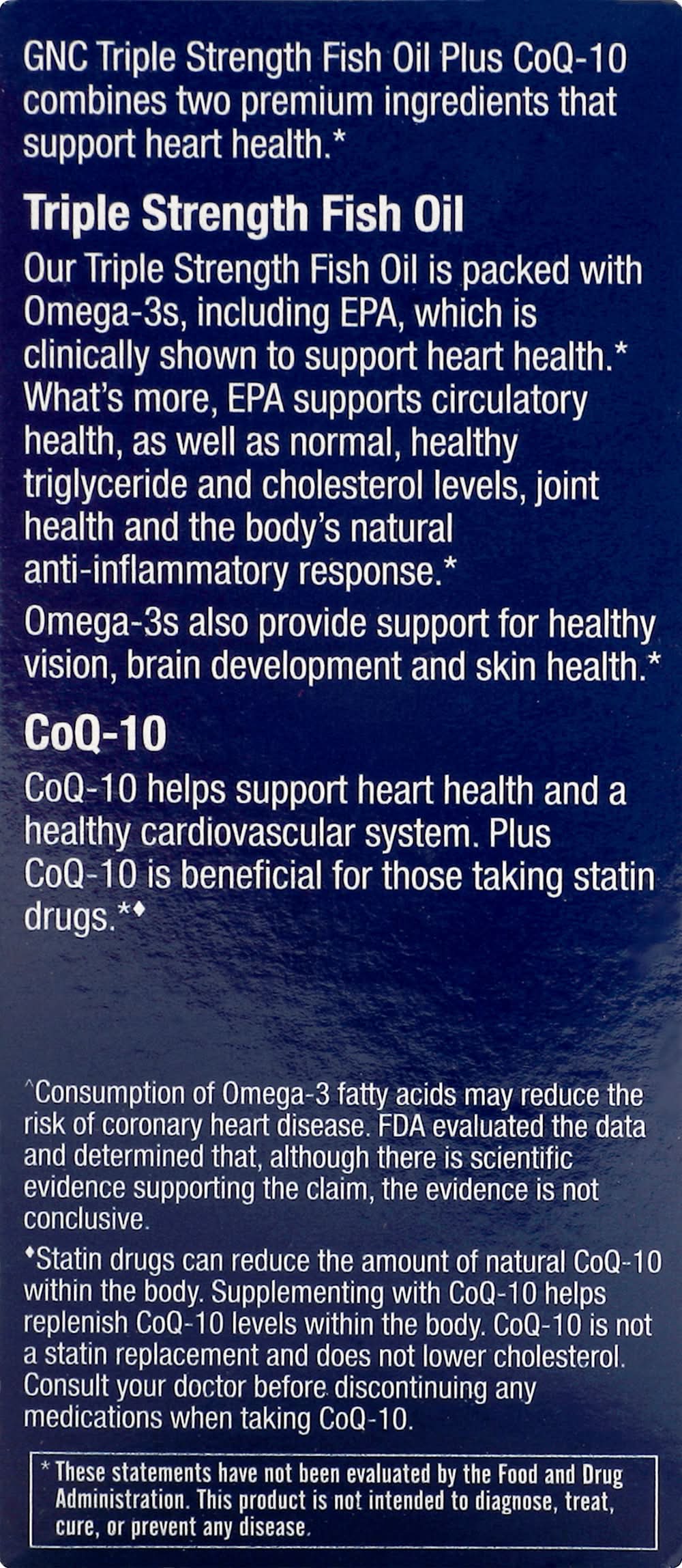 1000 mg of EPA/DHA Omega-3s & 100 mg of CoQ-10. May reduce the risk of coronary heart disease (Consumption of Omega-3 fatty acids may reduce the risk of coronary heart disease. FDA evaluated the data and determined that, although there is scientific evidence supporting the claim, the evidence is not conclusive). Omega-3 supplement. Certified purified. Our Quality Commitment to You: Since 1935, our mission as the industry leader has been to provide you with the highest-quality nutritional supplements. We continue to stand behind this mission. If you're not 100% satisfied with your purchase, return the unused portion of the product with your receipt within 30 days and we'll either refund your money or find a replacement product that is right for you. GNC Triple Strength Fish Oil Plus CoQ-10 combines two premium ingredients that support heart health. Triple Strength Fish Oil: Our Triple Strength Fish Oil is packed with Omega-3s, including EPA, which is clinically shown to support heart health. What's more, EPA supports circulatory health, as well as normal, healthy triglyceride and cholesterol levels, joint health and the body's natural anti-inflammatory response. Omega-3s also provide support for healthy vision, brain development and skin health. CoQ-10: CoQ-10 helps support heart health and a healthy cardiovascular system. Plus CoQ-10 is beneficial for those taking statin drugs (Statin drugs can reduce the amount of natural CoQ-10 within the body. Supplementing with CoQ-10 helps replenish CoQ-10 levels within the body. CoQ-10 is not a statin replacement and does not lower cholesterol. Consult your doctor before discontinuing any medications when taking CoQ-10). Potency verified by GNC procedure No. 5123. Conforms to USP less than 2091 greater than for weight. Enteric coated to help control fishy burps - guaranteed. Free from detectable levels of mercury, lead, heavy metals and PCBs. From wild, deep ocean fish. For More Information: 1-888-462-2548. Shop now (at) gnc.com. No sugar, no starch, no artificial flavors, no preservatives, no wheat, gluten free, no corn, no dairy. Please recycle this box. (These statements have not been evaluated by the Food and Drug Administration, This product is not intended to diagnose, treat, cure, or prevent any disease.) • General Nutrition Corporation, Pittsburgh, PA, 15222, Ph: 888-462-2548 • Packaging: Reusable