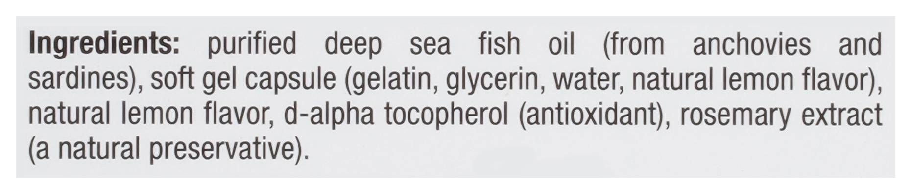 Ingredients: Purified Deep Sea Fish Oil (from Anchovies and Sardines), Soft Gel Capsule (Gelatin Glycerin Water Natural Lemon Flavor), Natural Lemon Flavor, D-Alpha Tocopherol (Antioxidant), Rosemary Extract (a Natural Preservative) Contains: Fish