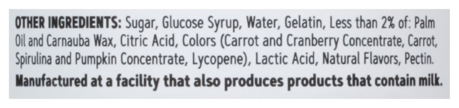 Ingredients: Other Ingredients: Sugar, Glucose Syrup, Water, Gelatin, Less than 2% of: Palm Oil and Carnauba Wax, Citric Acid, Colors (Carrot and Cranberry Concentrate Carrot Spirulina and Pumpkin Concentrate Lycopene), Lactic Acid, Natural Flavors, Pectin Contains: Milk