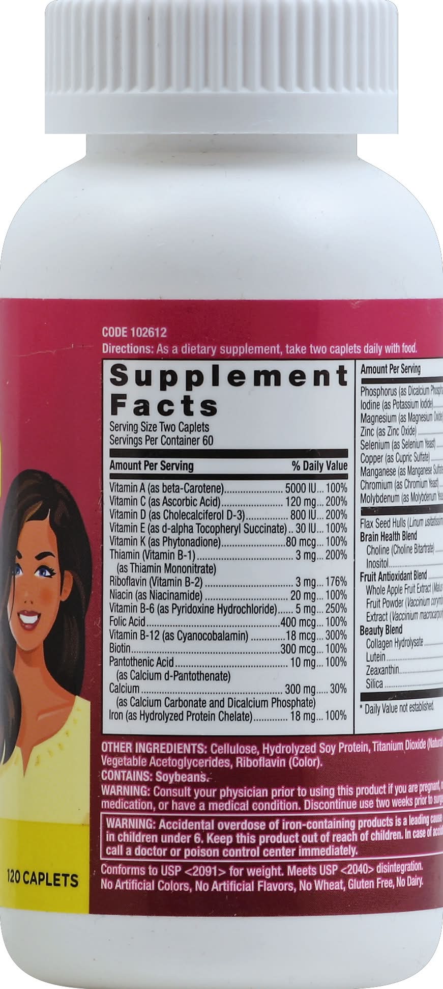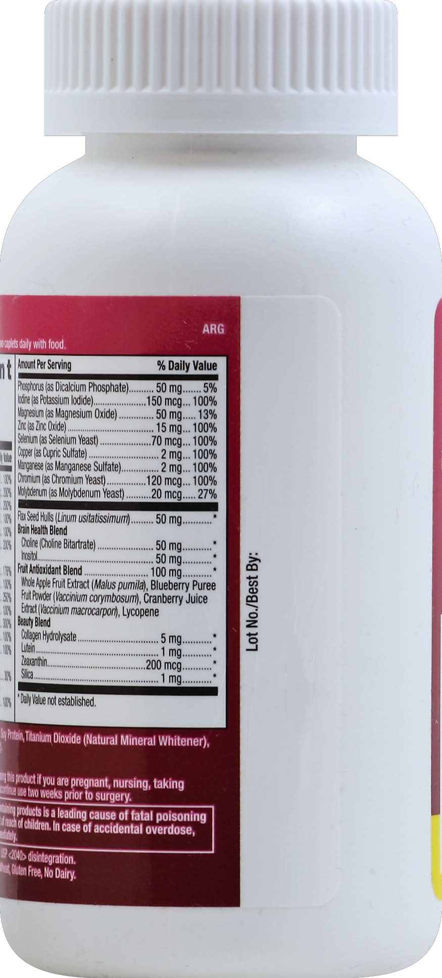 Ingredients: Brain Health Blend. Fruit Antioxidant Blend: Whole Apple Fruit Extract (Malus Pumila), Blueberry Puree Fruit Powder (Vaccinium Corymbosium), Cranberry Juice Extract (Vaccinium Macrocarpon), Lycopene. Beauty Blend. Other Ingredients: Cellulose, Hydrolyzed Soy Protein, Titanium Dioxide (Natural Mineral Whitener), Vegetable Acetoglycerides, Riboflavin (Color) Contains: 'Contains Soybeans'
