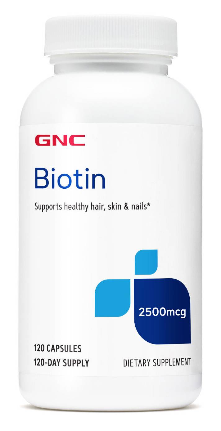GNC Biotin 2500 mcg is a supplement that provides a vitamin important to the development and maintenance of healthy skin, nails and hair. Natural sources of the nutrient include liver and other meats, milk and eggs. The body uses it to help energy metabolism. GNC biotin supplement may help address the symptoms of biotin deficiency. • Supports healthy skin, nails and hair • Helps prevent biotin deficiency • Manufactured without gluten, soy, or dairy products • Contains 240 capsules per container Size: 1