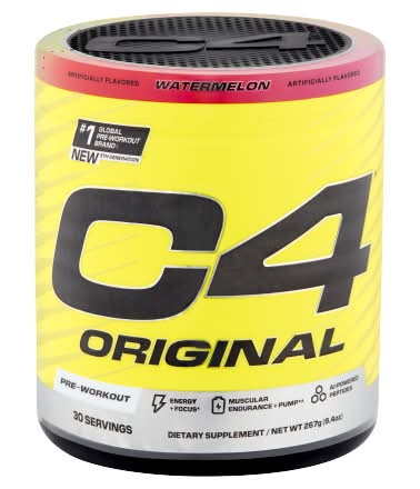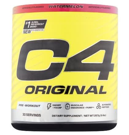 Cellucor - C4 Original Pre-Workout - Watermelon - 30 Servings C4 Original has been fueling athletes & fitness enthusiasts of all types for over a decade.* Explosive Energy* - Increased training intensity with 200mg of caffeine.* Muscular Endurance + Pump*^ - High-performance sessions powered by CarnoSyn Beta-Alanine and improved muscular pump with Velox Patented Performance Blend.* AI-Powered Peptides - Includes PeptiPump, AI-powered designer peptides only found in C4. Enhanced Focus* - Heightened focus to support mind-muscle connection with 200mg of caffeine and added Huperzine A.* • 200mg Caffeine • 2g CarnoSyn Beta-Alanine • 100mg PeptiPump Size: 1