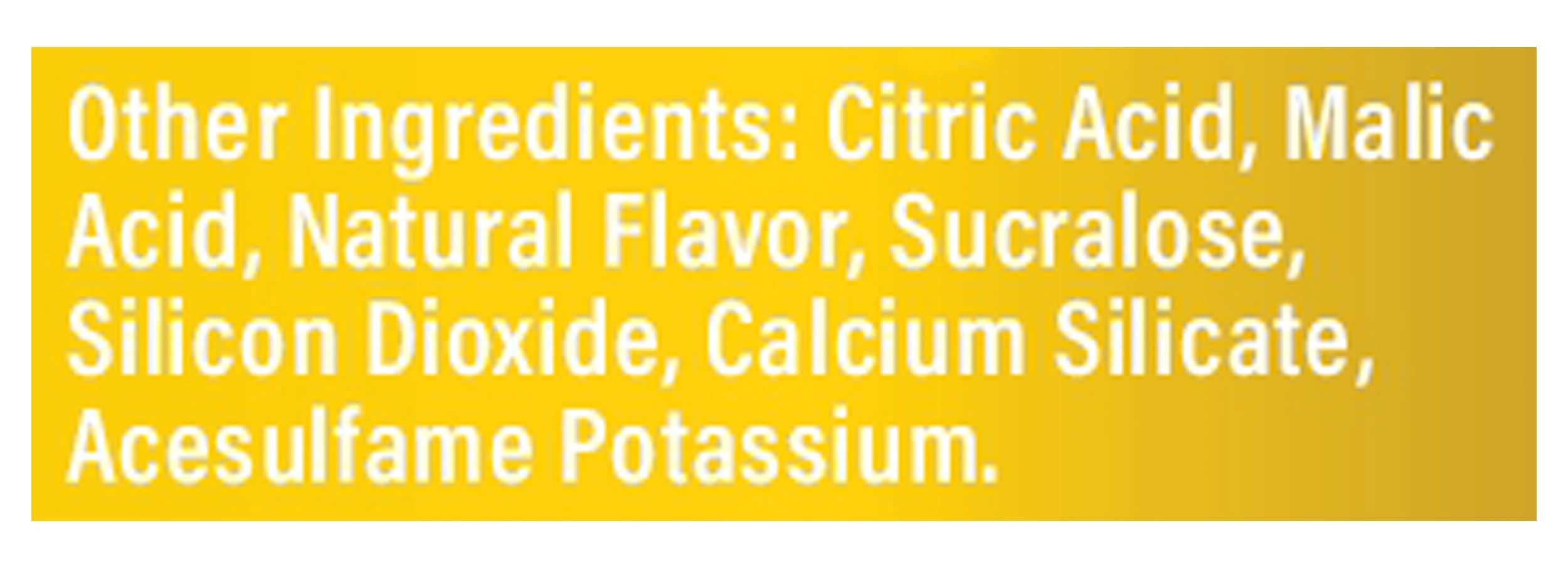 Ingredients: Other Ingredients: Citric Acid, Malic Acid, Natural Flavor, Sucralose, Silicon Dioxide, Calcium Silicate, Acesulfame Potassium Contains: Milk, Soybeans, Eggs, Wheat, Fish, Crustacean Shellfish, Molluscan Shellfish, Peanuts, Tree Nuts, Sesame
