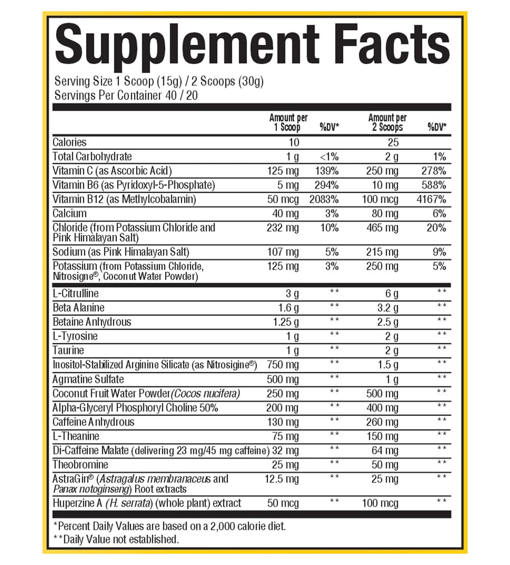 Suggested use: mix one (1) scoop with 8-12 fl oz of water and drink 30 minutes prior to training. to assess tolerance start with 1/2 scoop.