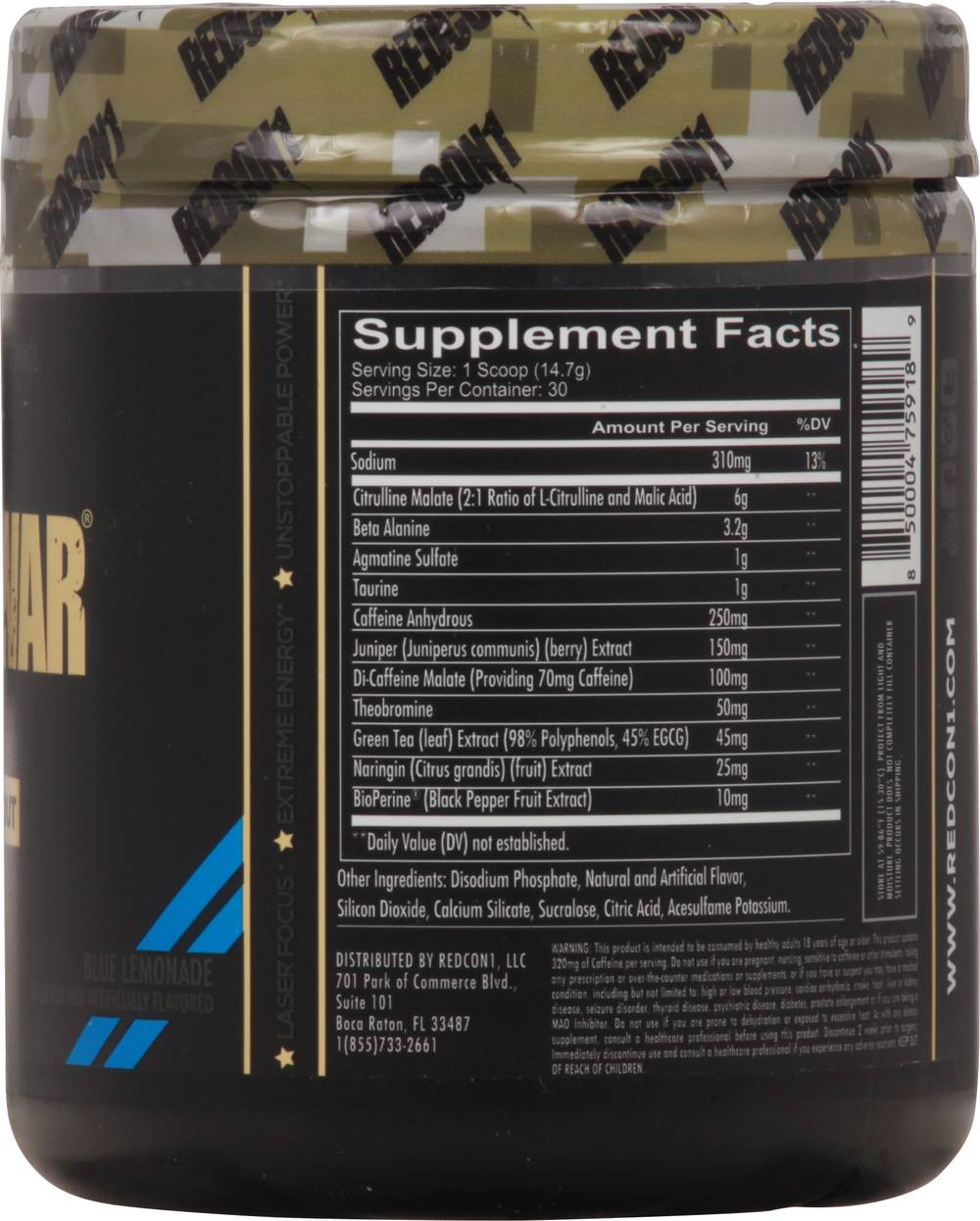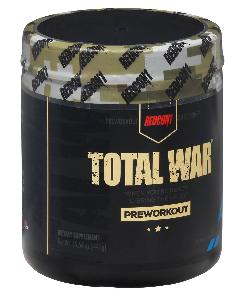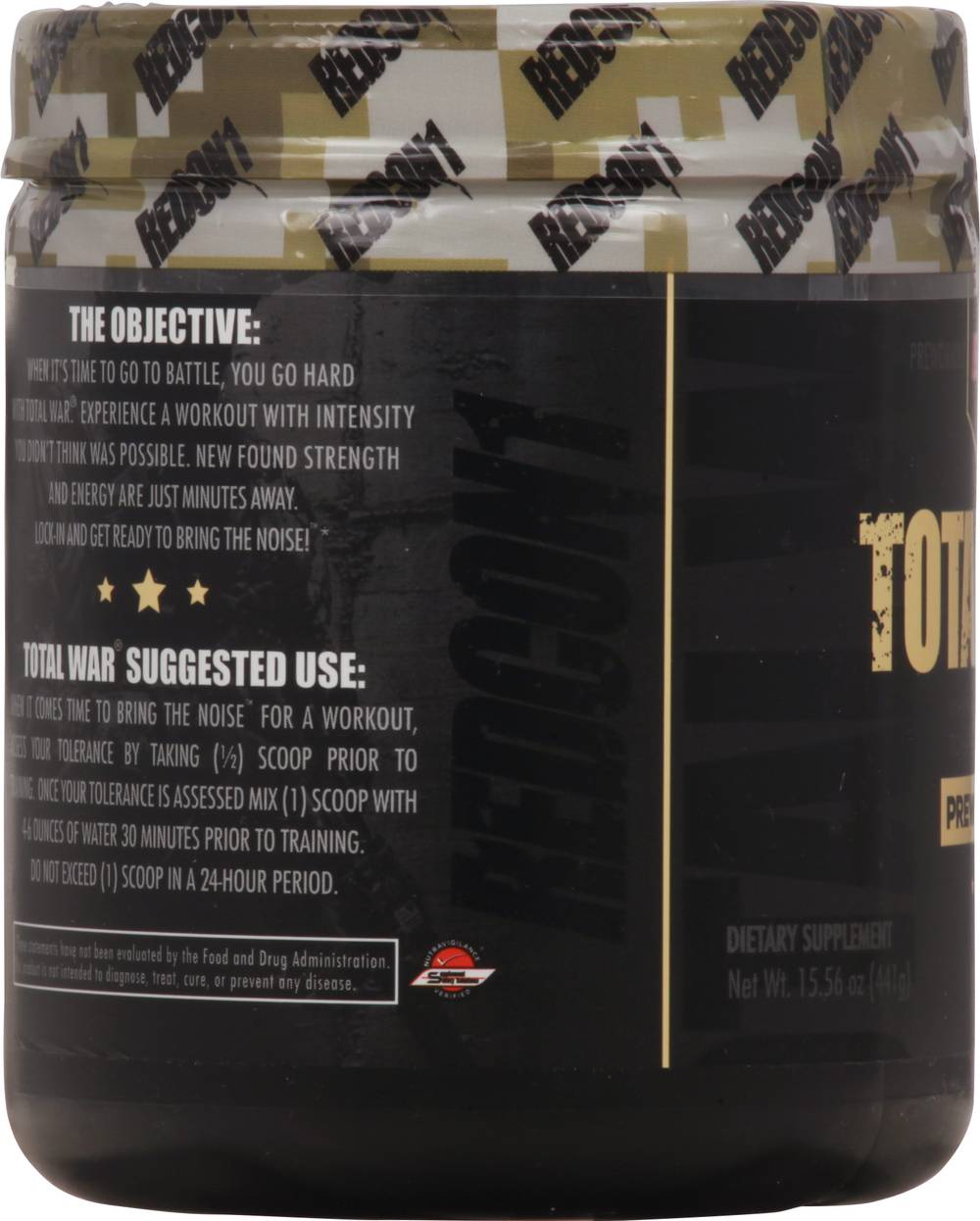 Dietary Supplement. Naturally and artificially flavored. When you're ready to bring the noise. The Objective: When it’s time to go battle, you go hard with total war. Experience a workout with intensity you didn’t think was possible. New found strength and energy are just minutes away. Lock in and get ready to bring the noise! Laser focus. Extreme energy. Unstoppable power. Preworkout 30 servings. Nutravigilance verified Supplement Safety Solutions. www.redcone1.com. Youtube. Facebook. Instagram. Twitter. (These statements have not been evaluated by the Food and Drug Administration. This product is not intended to diagnose, treat, cure, or prevent any disease.) • Size: 1 • Redcon1, Llc, Boca Raton, FL, 33487 • Packaging: Reusable
