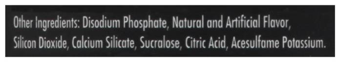 Ingredients: Other Ingredients: Disodium Phosphate, Natural and Artificial Flavor, Silicon Dioxide, Calcium Silicate, Sucralose, Citric Acid, Acesulfame Potassium