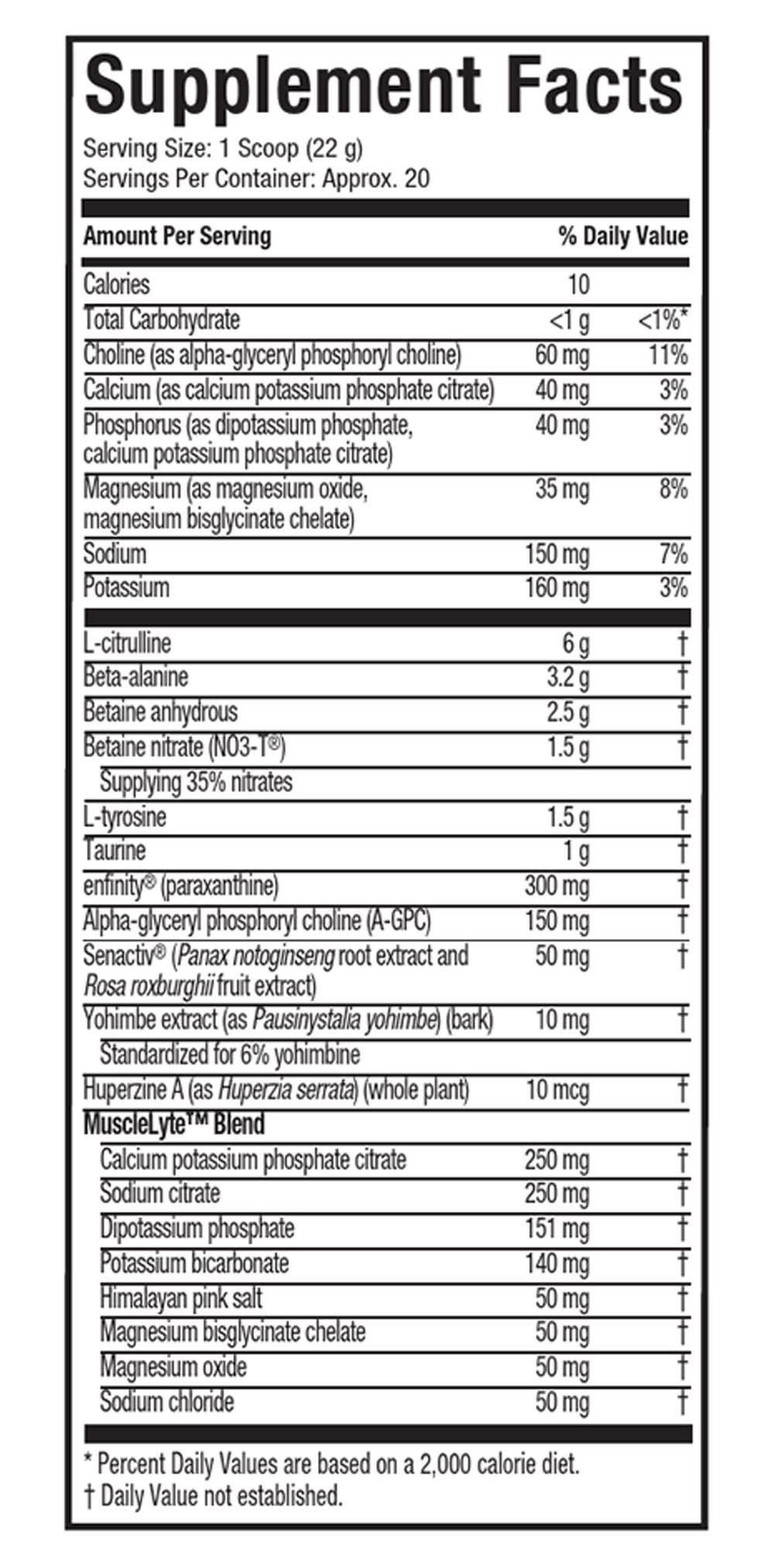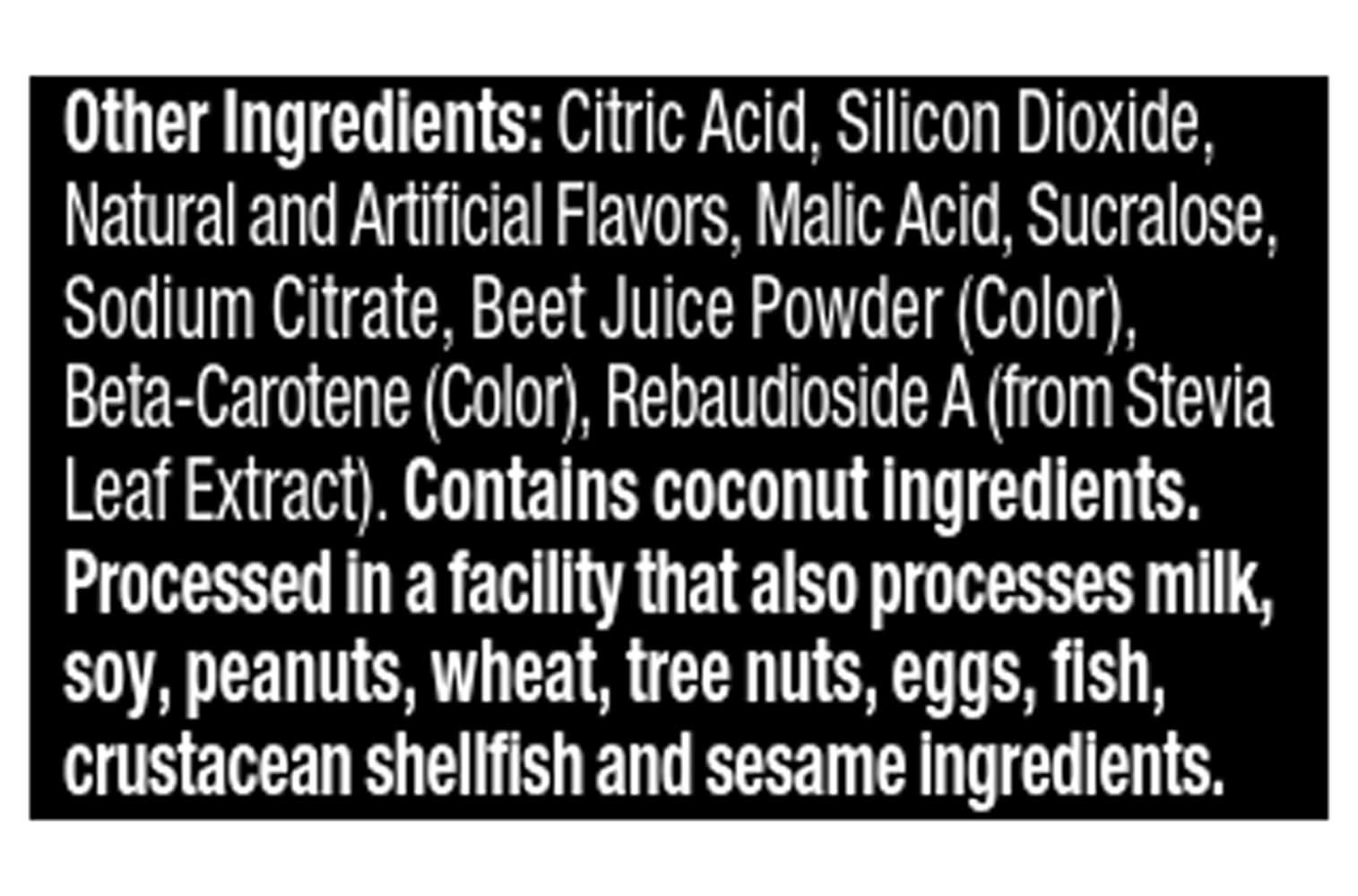 Ingredients: Musclelyte Blend: Calcium Potassium Phosphate Citrate, Sodium Citrate, Dipotassium Phosphate, Potassium Bicarbonate, Himalayan Pink Salt, Magnesium Bisglycinate Chelate, Magnesium Oxide, Sodium Chloride. Other Ingredients: Citric Acid, Silicon Dioxide, Natural and Artificial Flavors, Malic Acid, Sucralose, Sodium Citrate, Beet Juice Powder (Color), Beta-Carotene (Color), Rebaudioside a (from Stevia Leaf Extract) Contains: Tree Nuts, Coconuts, Milk, Soybeans, Peanuts, Wheat, Tree Nuts, Eggs, Fish, Crustacean Shellfish, Sesame