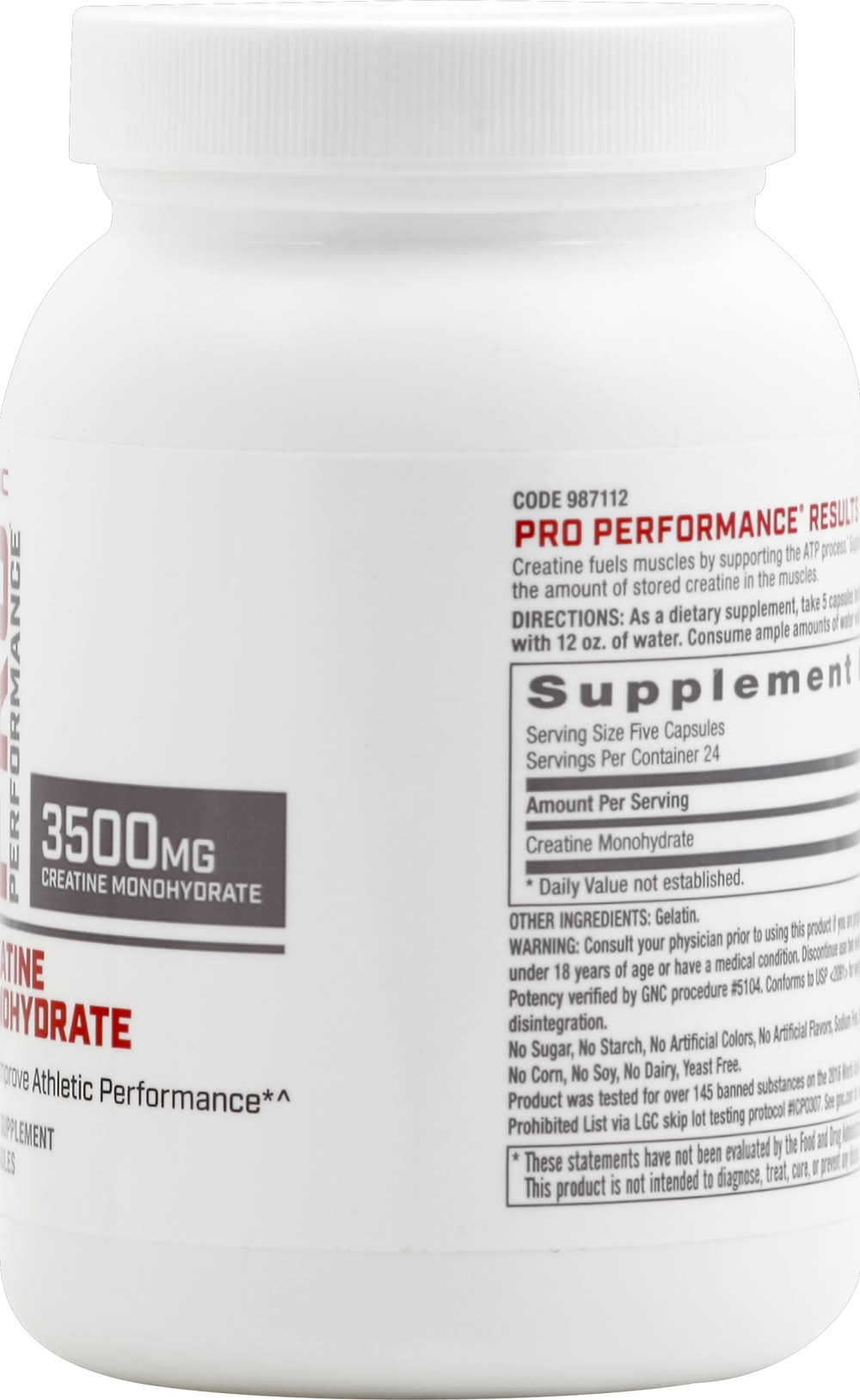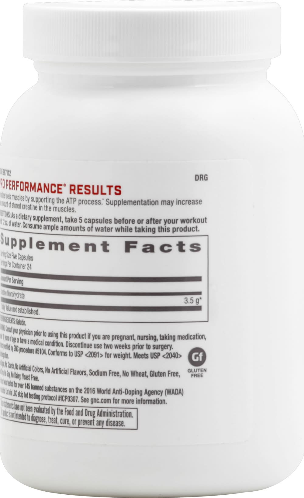 Dietary Supplement. Helps improve athletic performance (When used in conjunction with an exercise program). Gluten free. No sugar, no starch, no artificial colors, no artificial flavors, sodium free, no wheat, gluten free, no corn, no soy, no dairy, yeast free. Pro Performance Results: Creatine fuels muscles by supporting the ATP process. Supplementation may increase the amount of stored creatine in the muscles. Potency verified by GNC procedure 5104. Conforms to USP 2091 for weight. Meets USP 2040 disintegration. Protected was tested for over 145 banned substance on the 2016 World Anti-Doping Agency (WADA). Prohibited list via LGC skip lot testing protocol ICP0307. See gnc.com for more information. For More Information: 1-888-462-2548. Shop now (at) GNC.com. (These statements have not been evaluated by the Food and Drug Administration. This product is not intended to diagnose, treat, cure, or prevent any disease.)