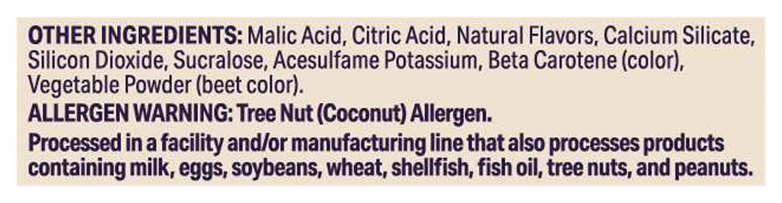 Ingredients: Other Ingredients: Malic Acid, Citric Acid, Natural Flavors, Calcium Silicate, Silicon Dioxide, Sucralose, Acesulfame Potassium, Beta Carotene (Color), Vegetable Powder (Beet Color) Contains: Tree Nuts, Coconuts, Milk, Eggs, Soybeans, Wheat, Crustacean Shellfish, Molluscan Shellfish, Fish, Tree Nuts, Peanuts