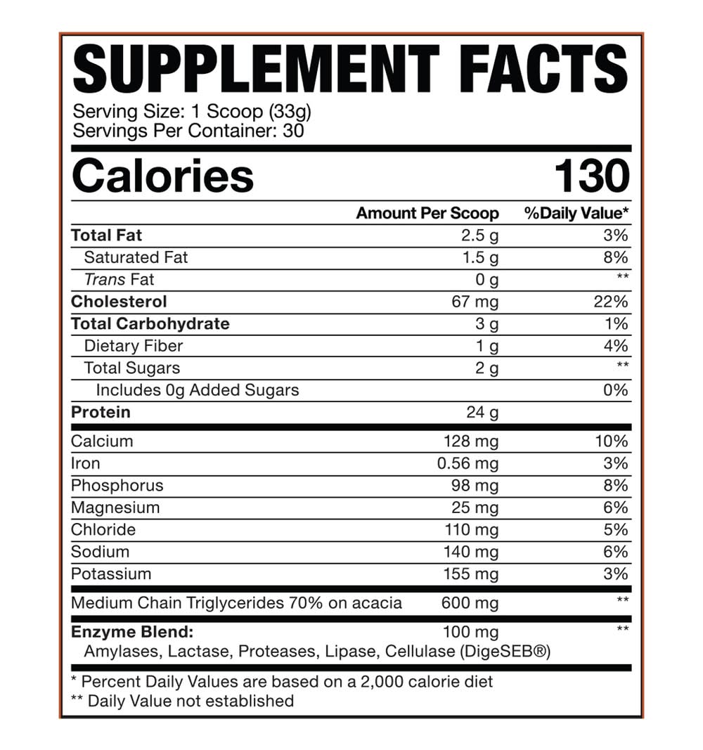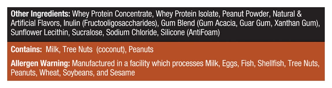 Ingredients: Enzyme Blend: Amylases, Lactase, Proteases, Lipase, Cellulase (Digeseb). Other Ingredients: Whey Protein Concentrate, Whey Protein Isolate, Peanut Powder, Natural & Artificial Flavors, Inulin (Fructooligosaccharides), Gum Blend (Gum Acacia, Guar Gum, Xanthan Gum), Sunflower Lecithin, Sucralose, Sodium Chloride, Silicone (Antifoam) Contains: Peanuts, Milk, Tree Nuts, Coconuts, Milk, Eggs, Fish, Crustacean Shellfish, Tree Nuts, Wheat, Soybeans, Sesame