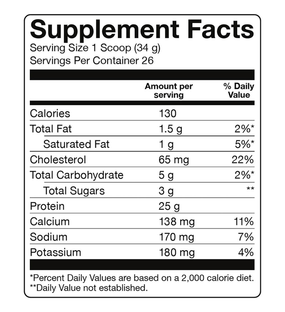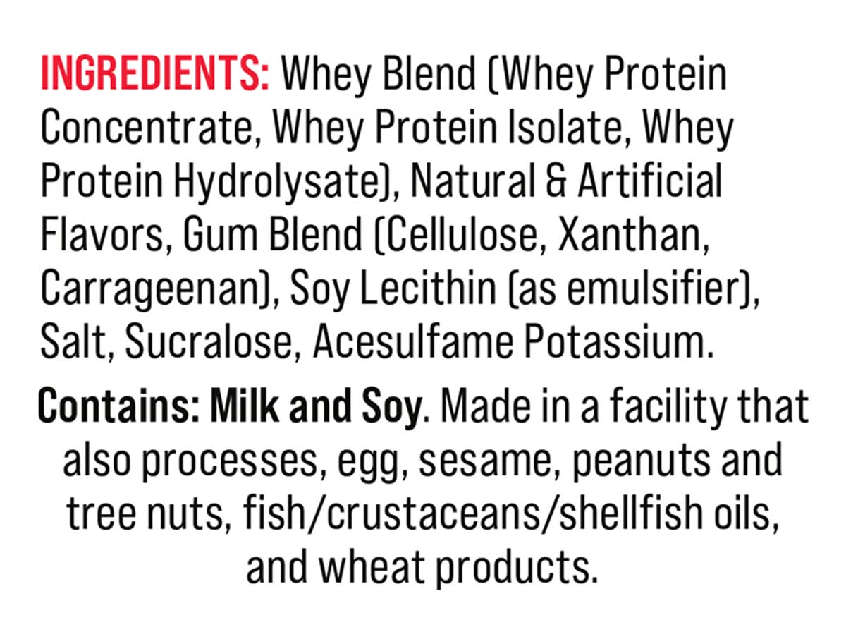 Ingredients: Whey Blend (Whey Protein Concentrate, Whey Protein Isolate, Whey Protein Hydrolysate), Natural & Artificial Flavors, Gum Blend (Cellulose, Xanthan, Carrageenan), Soy Lecithin (as Emulsifier), Salt, Sucralose, Acesulfame Potassium Contains: Soybeans, Milk, Eggs, Sesame, Peanuts, Tree Nuts, Crustacean Shellfish, Fish, Molluscan Shellfish, Wheat