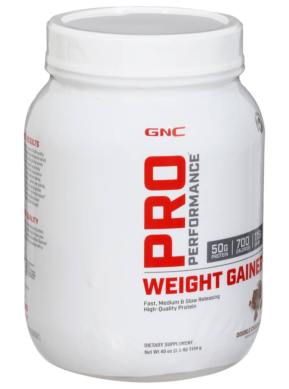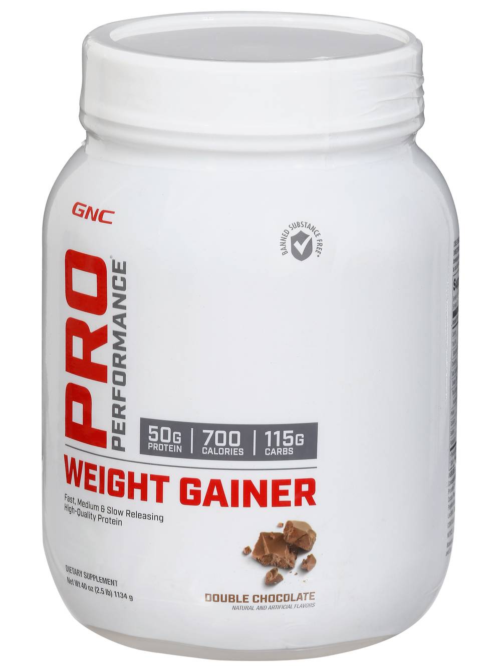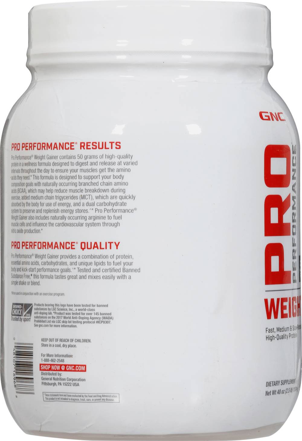 Dietary Supplement Natural and artificial flavors. 50 g protein; 700 calories; 115 g carbs. Banned substance free (Product was tested for over 145 banned substances on the 2017 World Anti-Doping Agency (WADA) Prohibited List via LGC skip lot testing protocol no. ICP0307. See gnc.com for more information). Fast, medium & slow releasing high-quality protein. Pro Performance Results: Pro Performance Weight Gainer contains 50 grams of high-quality protein in a wellness formula designed to digest and release at varied intervals throughout the day to ensure your muscles get the amino acids they need. This formula is designed to support your body composition goals with naturally occurring branched chain amino acids (BCAA), which may help reduce muscle breakdown during exercise, added medium chain triglycerides (MCT), which are quickly absorbed by the body for use of energy, and a dual carbohydrate system to preserve and replenish energy stores (When used in conjunction with an exercise program). Pro Performance Weight Gainer also includes naturally occurring arginine to fuel muscle cells and influence the cardiovascular system through nitric oxide production. Pro Performance Quality: Pro Performance Weight Gainer provides a combination of protein, essential amino acids, carbohydrates, and unique lipids to fuel your body and kick-start performance goals (When used in conjunction with an exercise program). Tested and certified Banned Substance Free (Product was tested for over 145 banned substances on the 2017 World Anti-Doping Agency (WADA) Prohibited List via LGC skip lot testing protocol no. ICP0307. See gnc.com for more information), this formula tastes great and mixes easily with a simple shake or blend. Informed-Choice.org. Trusted by sport. Products bearing this logo have been tested for banned substances by LGC Science, Inc., a world-class anti-doping lab. Notice: Significant product settling may occur. gnc.com. For More Information: 1-888-462-2548. Shop (at) gnc.com. (These statements have not been evaluated by the Food and Drug Administration. This product is not intended to diagnose, treat, cure or prevent any disease.) • Size: 1 • Packaging: Reusable