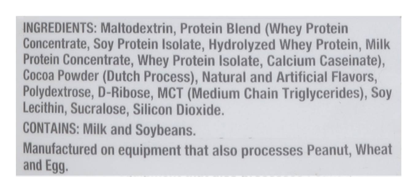 Ingredients: Maltodextrin, Protein Blend (Whey Protein Concentrate Soy Protein Isolate Hydrolyzed Whey Protein Milk Protein Concentrate Whey Protein Isolate Calcium Caseinate), Cocoa Powder (Dutch Process), Natural and Artificial Flavors, Polydextrose, D-Ribose, MCT (Medium Chain Triglycerides), Soy Lecithin, Sucralose, Silicon Dioxide Contains: Milk, Soybeans, Peanuts, Wheat, Eggs