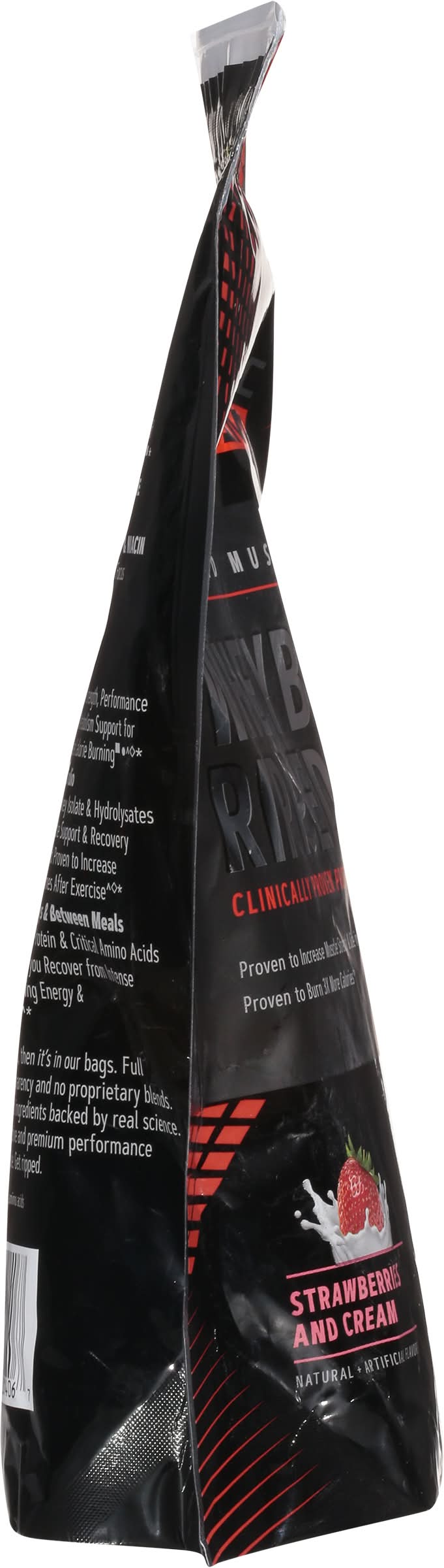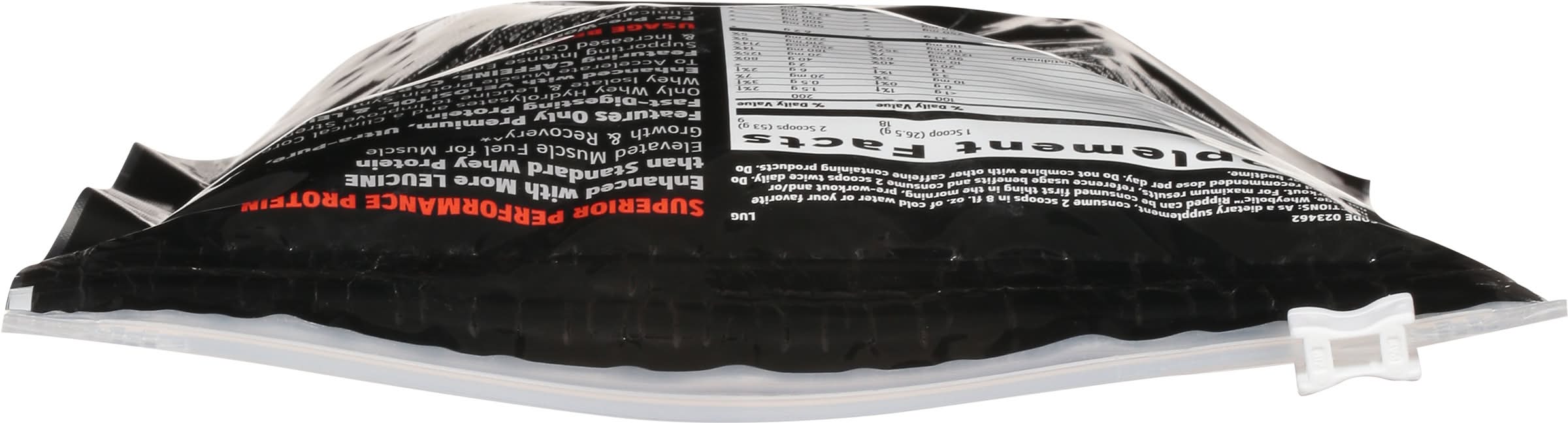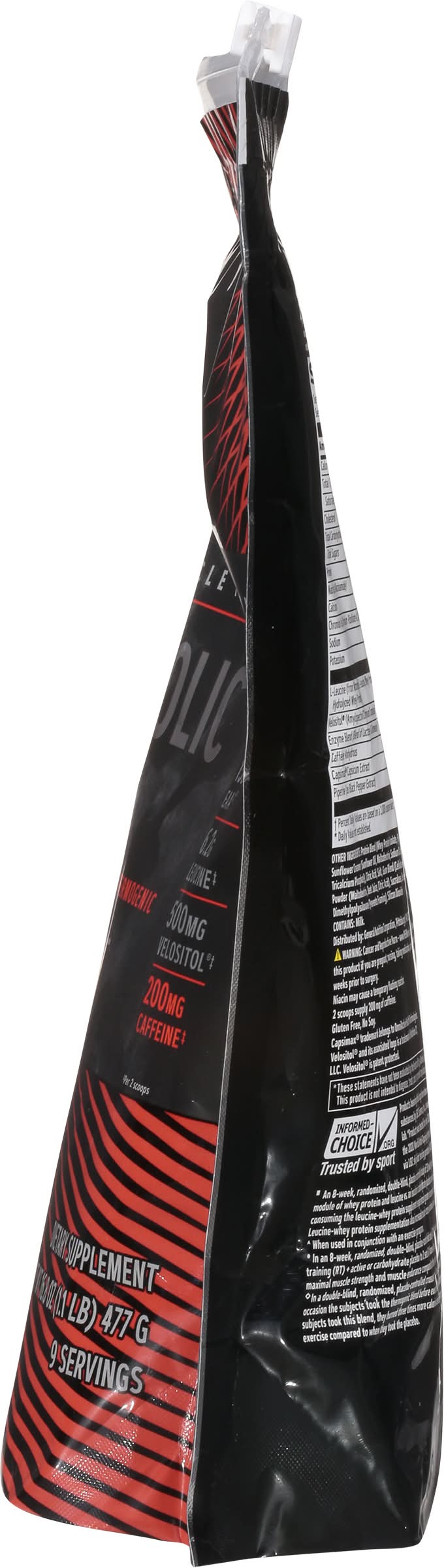 Natural + artificial flavors. 40g protein (per 2 scoops). 15g EAA (per 2 scoops) (EAA = essential amino acids). 6.2g leucine (Per 2 scoops). 500mg Velositol (per 2 scoops). 200mg caffeine (per 2 scoops). Gluten Free, No Soy. 2 scoops supply 200 mg of caffeine. Advanced Muscle Performance. Clinically proven protein + thermogenic. Proven to Increase Muscle Strength & Size in Just 8 Weeks(An 8-week, randomized, double-blind, placebo-controlled study of 33 healthy men compared the effectiveness of this proprietary module of whey protein and leucine vs. an isocaloric carbohydrate placebo consumed before and after resistance training. Subjects consuming the leucine-whey protein supplement experienced greater increases in muscle strength than those on the placebo. Leucine-whey protein supplementation also increased muscle cross-sectional area from baseline). Proven to Burn 3X More Calories (In a double-blind, randomized, placebo-controlled crossover study, 25 subjects exercised on a treadmill on two occasions. On one occasion the subjects took the thermogenic blend before exercise and on the second occasion, they took a placebo. When the subjects took this blend, they lamed three times more calories before, 3% more calories during and 12 times more calories after exercise compared to when they took the placebo). 9 serving. Banned substance free. Superior performance protein: Enhanced with more leucine than standard whey protein elevated muscle fuel for muscle growth & recovery (When used in conjunction with an exercise program). Features only premium, ultra-pure, fast-digesting protein: Only whey hydrolysates and a clinical core of whey isolate & leucine to improve strength (An 8-week, randomized, double-blind, placebo-controlled study of 33 healthy men compared the effectiveness of this proprietary module of whey protein and leucine vs. an isocaloric carbohydrate placebo consumed before and after resistance training. Subjects consuming the leucine-whey protein supplement experienced greater increases in muscle strength than those on the placebo. Leucine-whey protein supplementation also increased muscle cross-sectional area from baseline). Enhanced with Velositol & leucine: To accelerate muscle protein synthesis (When used in conjunction with an exercise program). Featuring caffeine, Capsimax & Niacin: Supporting intense energy, mental focus & increased calorie burning (In a double-blind, randomized, placebo-controlled crossover study, 25 subjects exercised on a treadmill on two occasions. On one occasion the subjects took the thermogenic blend before exercise and on the second occasion, they took a placebo. When the subjects took this blend, they lamed three times more calories before, 3% more calories during and 12 times more calories after exercise compared to when they took the placebo). If it's on our labels, then it's in our bags. Full dosing, full transparency and no proprietary blends. Clinically studied ingredients backed by real science. The most effective and premium performance protein available. Get ripped. Informed-Choice.org. Trusted by sport. Products bearing this logo have been tested for banned substances by LGC Science, Inc., a world-class anti-doping lab. Product was tested for over 220 banned substances on the 2020 World Anti-Doping Agency (WADA) Prohibited List via LGC skip lot testing protocol ICP0307. (These statements have not been evaluated by the Food and Drug Administration. This product is not intended to diagnose, treat, cure, or prevent any disease.) Size: 1