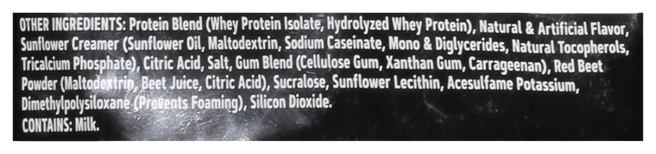 Ingredients: Other Ingredients: Protein Blend (Whey Protein Isolate Hydrolyzed Whey Protein), Natural & Artificial Flavor, Sunflower Creamer (Sunflower Oil Maltodextrin Sodium Caseinate Mono & Diglycerides Natural Tocopherols Tricalcium Phosphate), Citric Acid, Salt, Gum Blend (Cellulose Gum Xanthan Gum Carrageenan), Red Beet Powder (Maltodextrin Beet Juice Citric Acid), Sucralose, Sunflower Lecithin, Acesulfame Potassium, Dimethylpolysiloxane (Prevents Foaming), Silicon Dioxide Contains: Milk