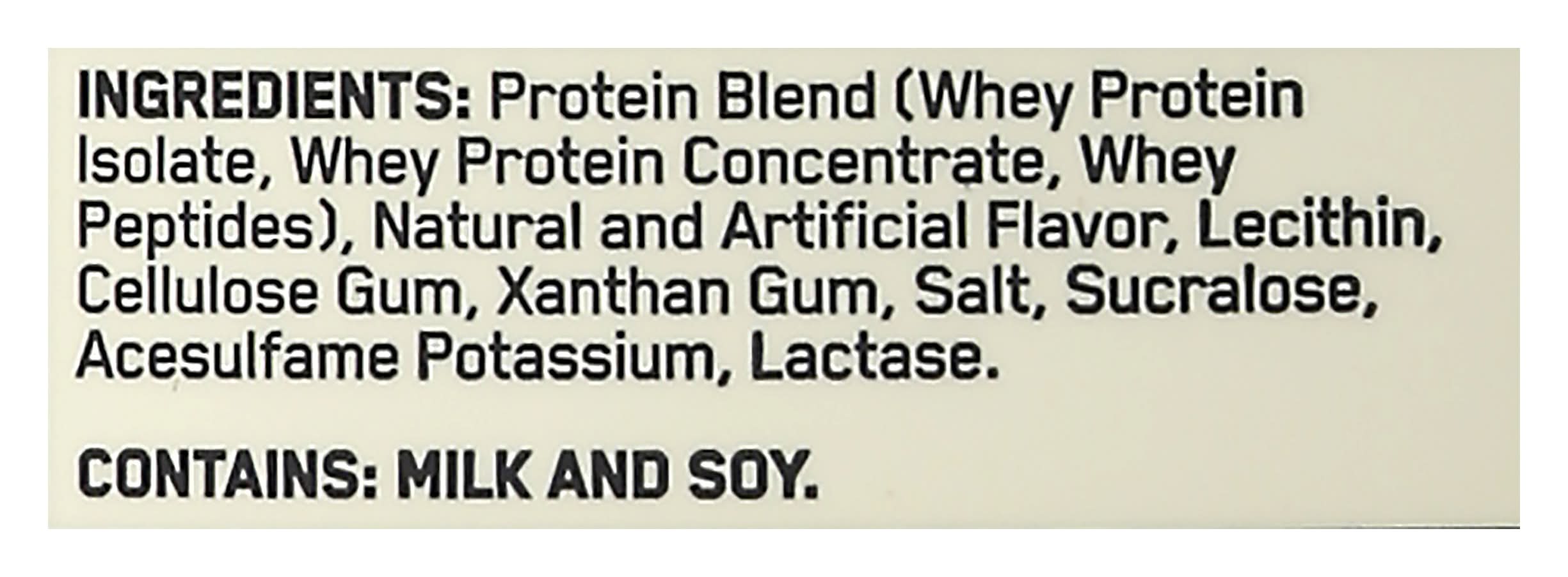 Ingredients: Protein Blend (Whey Protein Isolate Whey Protein Concentrate Whey Peptides), Natural and Artificial Flavor, Lecithin, Natural and Artificial Flavor, Acesulfame Potassium, Lactase Contains: Milk, Soybeans