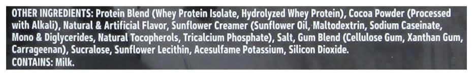 Ingredients: Other Ingredients: Protein Blend (Whey Protein Isolate Hydrolyzed Whey Protein), Cocoa Powder (Processed with Alkali), Natural & Artificial Flavor, Sunflower Creamer (Sunflower Oil Maltodextrin Sodium Caseinate Mono & Diglycerides Natural Tocopherols Tricalcium Phosphate), Salt, Gum Blend (Cellulose Gum Xanthan Gum Carrageenan), Sucralose, Sunflower Lecithin, Acesulfame Potassium, Silicon Dioxide Contains: Milk