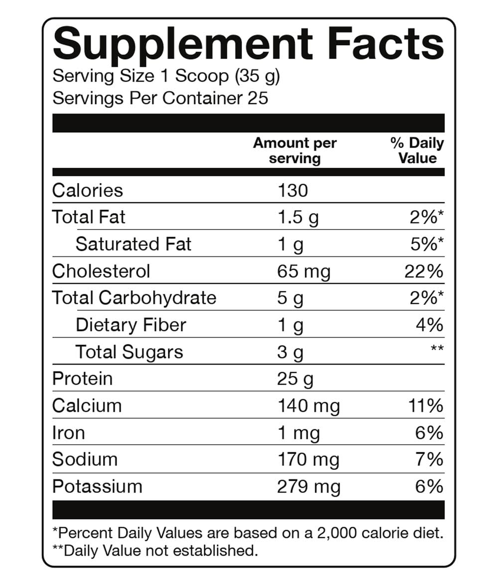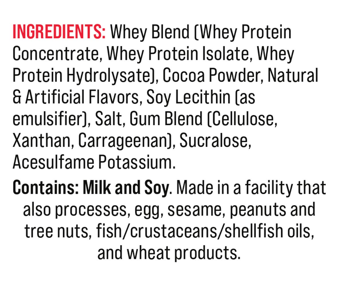 Ingredients: Whey Blend (Whey Protein Concentrate, Whey Protein Isolate, Whey Protein Hydrolysate), Cocoa Powder, Natural & Artificial Flavors, Soy Lecithin (as Emulsifier), Salt, Gum Blend (Cellulose, Xanthan, Carrageenan), Sucralose, Acesulfame Potassium Contains: Milk, Soybeans, Eggs, Sesame, Peanuts, Tree Nuts, Fish, Crustacean Shellfish, Wheat