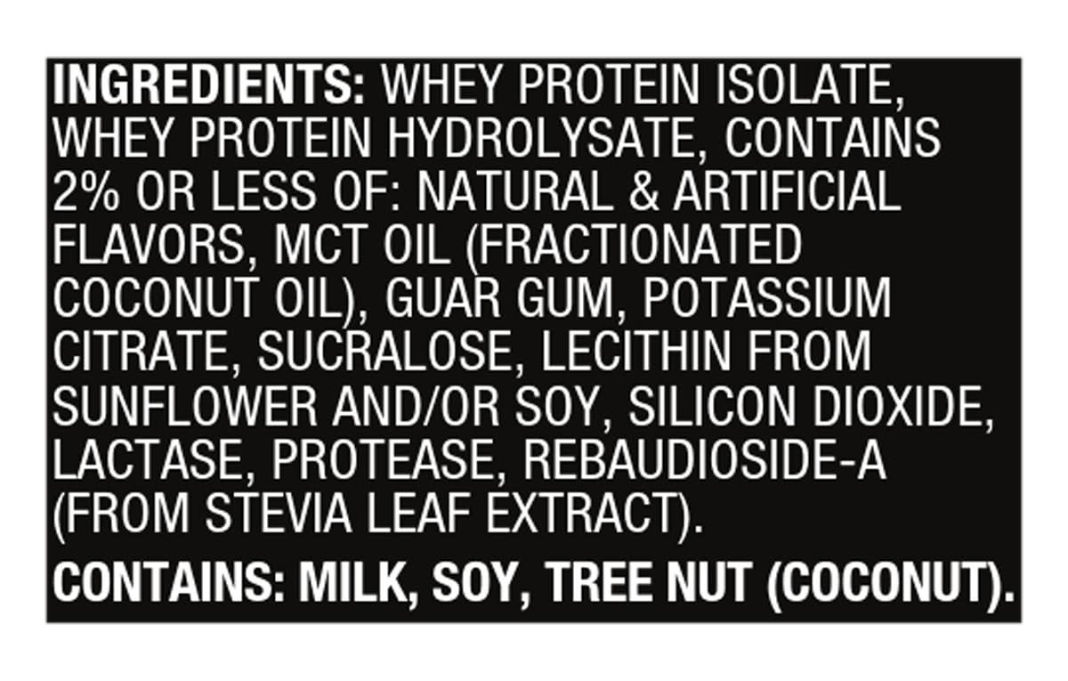 Ingredients: Whey Protein Isolate, Whey Protein Hydrolysate, Contains 2% or Less of: Natural & Artificial Flavors, MCT Oil (Fractionated Coconut Oil), Guar Gum, Potassium Citrate, Sucralose, Lecithin from Sunflower and/or Soy, Silicon Dioxide, Lactase, Protease, Rebaudioside-A (from Stevia Leaf Extract) Contains: Milk, Soybeans, Fish