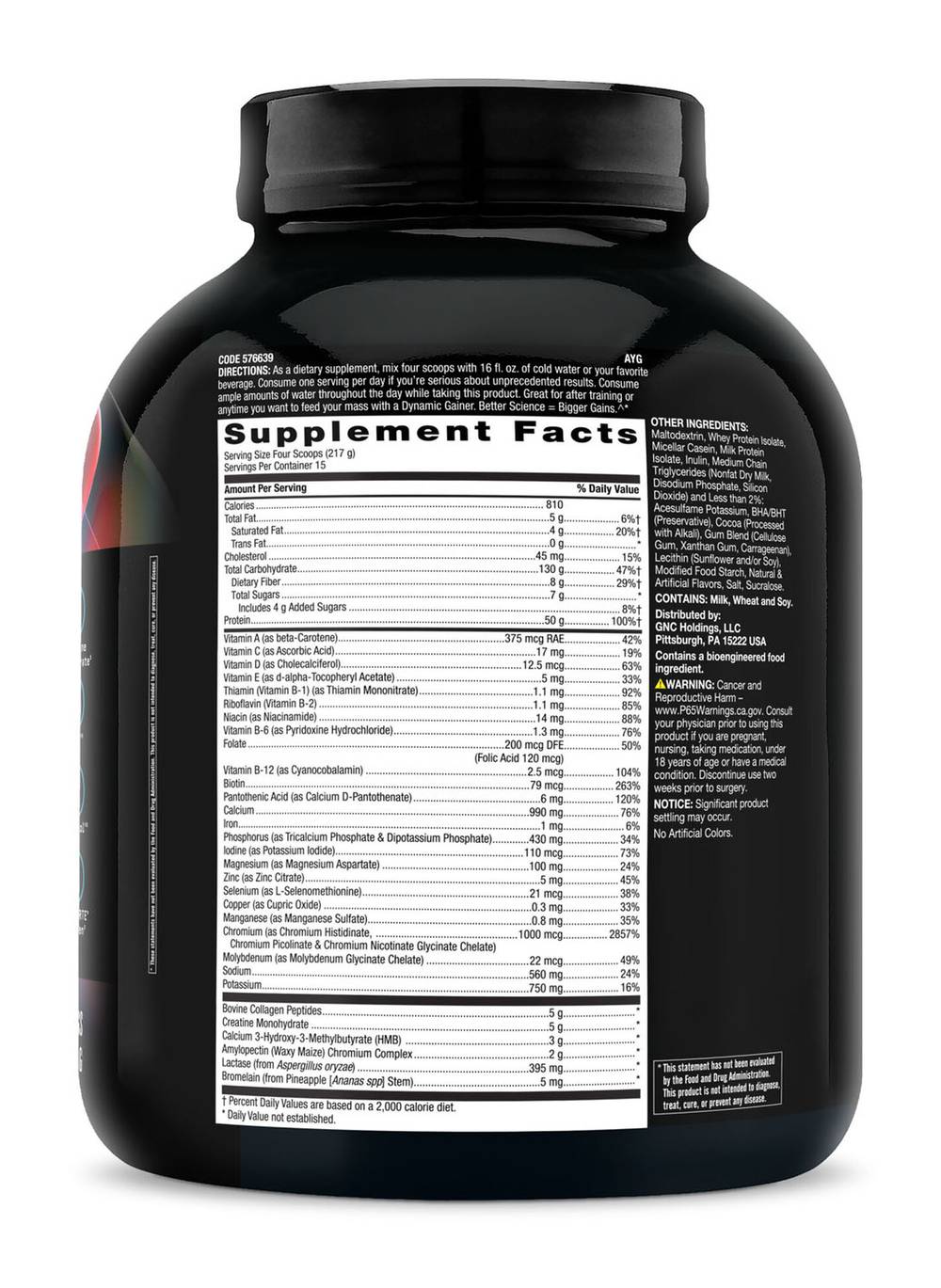 BEYOND RAW® DYNAMIC GAINER HIGH-TECH MASS GAINER: CHOCOLATE ÉCLAIR - 15 SERVINGS • BETTER SCIENCE = BIGGER GAINS: BEYOND RAW® Dynamic Gainer is a first-ever combination of technology-enhanced protein with performance support and meticulously crafted calories, carbs, and fats*. • ABSORB MORE EAAs AND BCAAs FROM YOUR MASS GAINER: plasma-ionized whey isolate helps you absorb more aminos compared to standard protein powder*. • THE ONLY GAINER WITH CREATINE, myHMB®, AND VELOSITOL®: Dynamic Gainer supports unprecedented muscle mass and muscle protein synthesis *^. • COLLAGEN SUPPORTS JOINTS FOR HEAVY LIFTS: Tendoforte® bioactive collagen peptides are clinically shown to enhance joint stability and increase tendon thickness*^. • ENZYMES HELP RELEASE KEY NUTRIENTS: Dynamic Gainer includes digestive enzymes to help ease digestion and release vital nutrients*. *These statements have not been evaluated by the Food and Drug Administration. This product is not intended to diagnose, treat, cure, or prevent any disease. ^When combined with exercise. • Flavor: Chocolate éclair • Size: 1