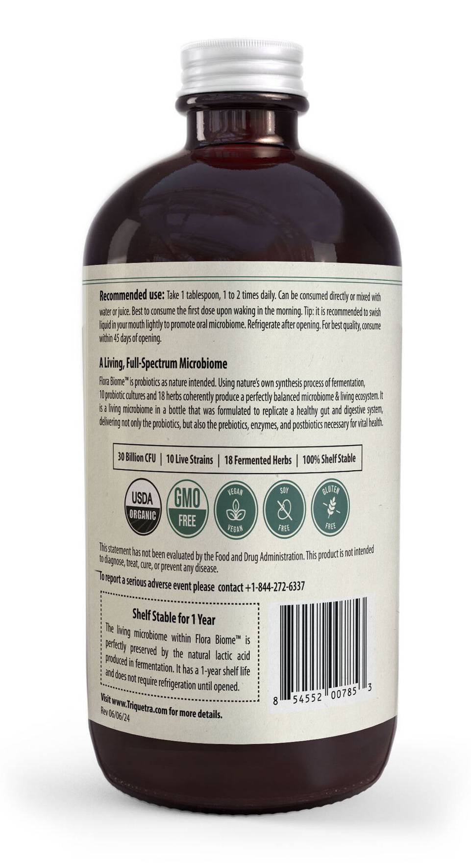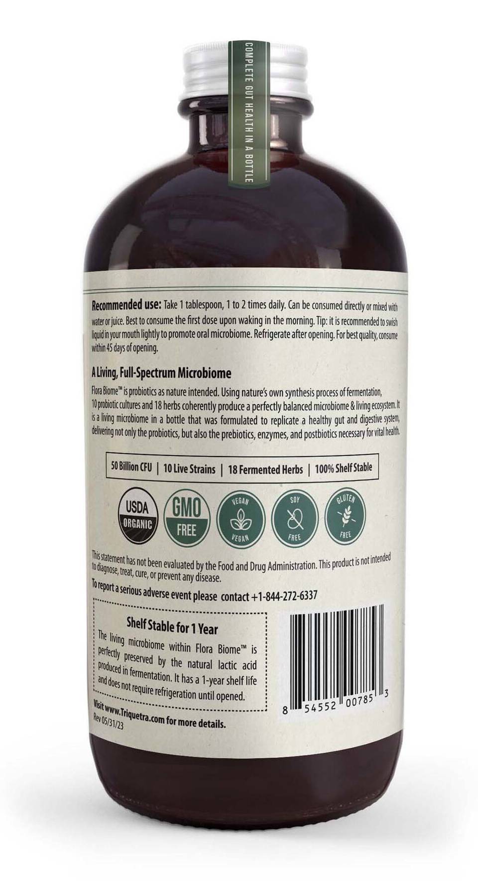 Triquetra - Flora Biome 3 in 1 Live Probiotic - 16 fl oz A Living, Full-Spectrum Microbiome Flora Biome™ is probiotics as nature intended. Using nature's own synthesis process of fermentation, 10 probiotic cultures and 18 herbs coherently produce a perfectly balanced microbiome & living ecosystem. It is a living microbiome in a bottle that was formulated to replicate a healthy gut and digestive system, delivering not only the probiotics, but also the prebiotics, enzymes, and postbiotics necessary for vital health. • 50 Billion CFU • 3 in 1 | Prebiotic, Probiotic, Postbiotic • 10 Live Strains • 18 Fermented Herbs • 100% Shelf Stable