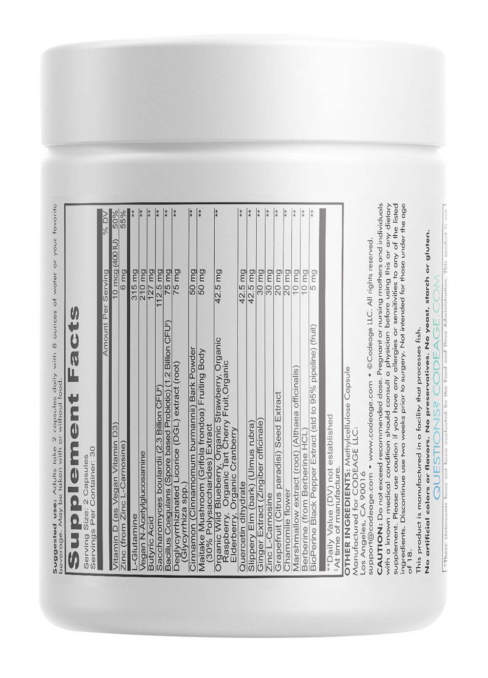 Leaky Gut Formula Prebiotic - Probiotic - Postbiotic LEAKY GUT SUPPLEMENT FORMULA OFFERS A LARGE VARIETY OF INGREDIENTS TO HELP SUPPORT LEAKY GUT AND OVERALL GUT WELLNESS.* Codeage Leaky Gut supplement offers a comprehensive supplement formula to help support leaky gut.* This formula combines L-glutamine, plant-based vitamin D cholecalciferol, and zinc. L-Glutamine is an amino acid found in the body and plays a role in protein production. It is an ingredient of choice to help support gut health and leaky gut.* N-Acetylglucosamine is a glucose derivative that may play a role in supporting a leaky gut. Butyric acid is the conjugate base of butyrate. It can be produced by friendly bacteria living in your colon. Butyric Acid, which can also be naturally found in butter and ghee, may also support the stomach lining and intestines.* This supplement formula offers a concentrated polyphenol blend, including organic wild blueberry, strawberry, raspberry, tart cherry, elderberry, and cranberry. Moreover, this gut health support formula features probiotics, quercetin, cinnamon, ginger, grapefruit, maitake mushroom, and slippery elm. Berberine HCL is a compound derived from certain plants and has been shown to have various wellness benefits, including helping to support gut health and sugar levels.* Deglycyrrhizinated Licorice, or DGL, is a form of licorice that has had glycyrrhizin removed. In at least one study, DGL was shown to help support the gut by promoting mucus activity.* This leaky gut supplement also offers BioPerine to enhance absorption.* What's L-glutamine? L-glutamine is an amino acid that is important for many functions in the body, including the immune system and digestive system.* What's butyric acid? Butyric acid is a short-chain fatty acid that is produced by the breakdown of fats in the body. It is also found in butter and other dairy products. What's berberine HCL? Berberine hydrochloride is a compound found in plants such as goldenseal, Oregon grape, and barberry. Traditional Chinese medicine has used berberine for centuries for its various health benefits. Berberine is thought to work by playing a role in the levels of adenosine monophosphate (AMP) in the body. AMP may be involved in multiple cellular processes, including energy production and cell signaling. Part or all the ingredients provided in this Codeage Leaky Gut formula at GNC can be received in adequate or extra amounts from food and regular diet alone. Individual results may vary and depend on a lot of factors including age, health conditions, diet, genetic markup, lifestyle, physical activity, and regular exercise. Gastrointestinal support supplement in pills is an alternative to glutamine powder, glutamine tablets, probiotics soft chews, chewable tablets and GI support liquid formula. *These statements have not been evaluated by the Food and Drug Administration. This product is not intended to diagnose, treat, cure, or prevent any disease. • Features L-glutamine, N acetylglucosamine, vitamin D, and zinc. • N-Acetylglucosamine and Butyric Acid for Intestines and Bowel Support* • Butyric acid: Often produced by the friendly bacteria in our color, butyric acid is the conjugate base of butyrate and may help support the gut* • Vegan, Paleo & keto-friendly, non-GMO, dairy, soy, and gluten-free • Manufactured in the USA in a cGMP-certified facility and third-party tested