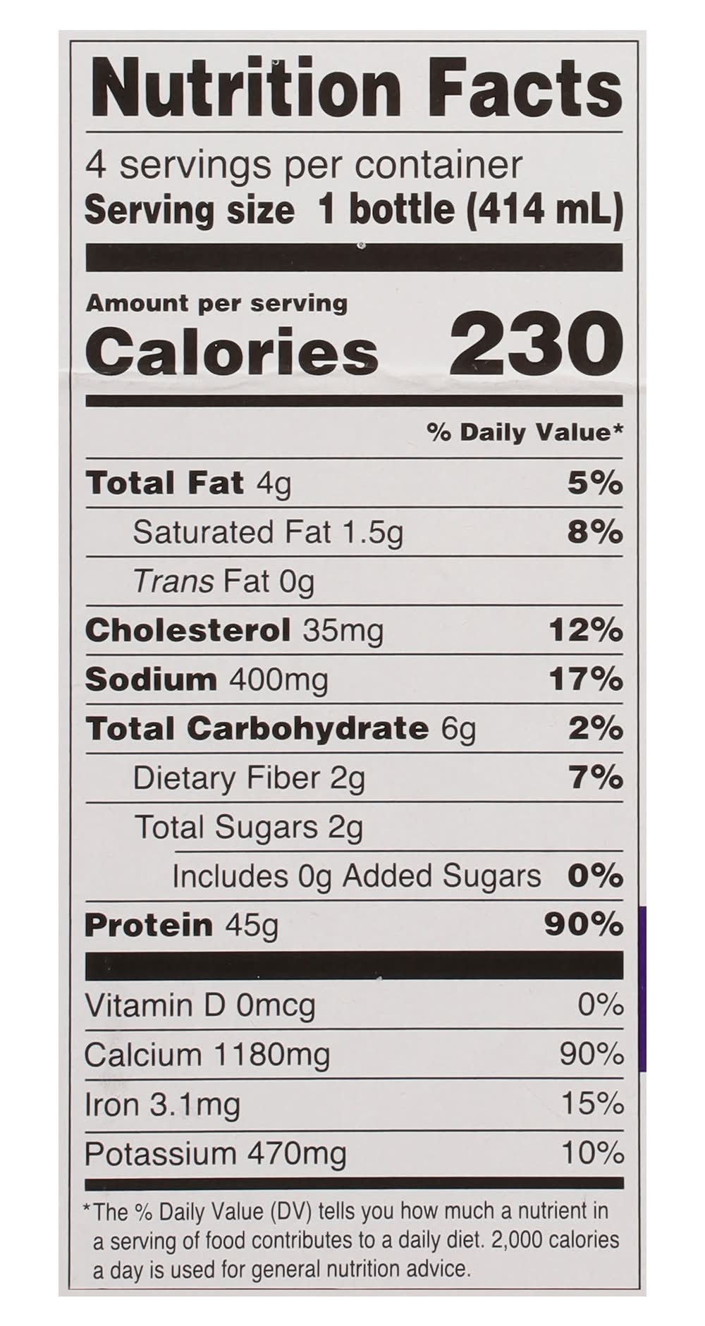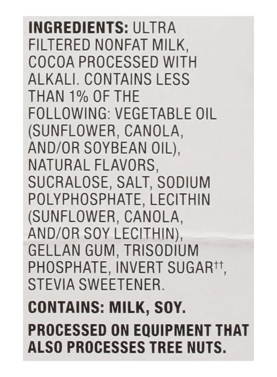Ingredients: Ultra Filtered Nonfat Milk, Cocoa Processed with Alkali, Contains Less than 1% of the Following: Vegetable Oil (Sunflower, Canola, and/or Soybean Oil), Natural Flavors, Sucralose, Salt, Sodium Polyphosphate, Lecithin (Sunflower, Canola, and/or Soy Lecithin), Gellan Gum, Trisodium Phosphate, Invert Sugar(a)(a), Stevia Sweetener. (a)(a) Adds a Trivial Amount of Added Sugars Contains: Milk, Soybeans, Tree Nuts
