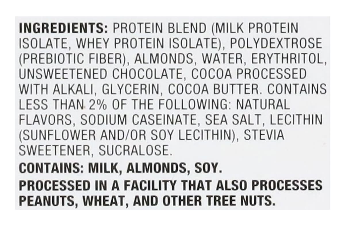 Ingredients: Protein Blend (Milk Protein Isolate, Whey Protein Isolate), Polydextrose (Prebiotic Fiber), Almonds, Water, Erythritol, Unsweetened Chocolate, Cocoa Processed with Alkali, Glycerin, Cocoa Butter, Contains Less than 2% of the Following: Natural Flavors, Sodium Caseinate, Sea Salt, Lecithin (Sunflower and/or Soy Lecithin), Stevia Sweetener, Sucralose Contains: 'Contains Milk', 'Contains Tree Nuts', 'May Contain Eggs', 'May Contain Soybeans', 'May Contain Wheat', 'May Contain Tree Nuts'