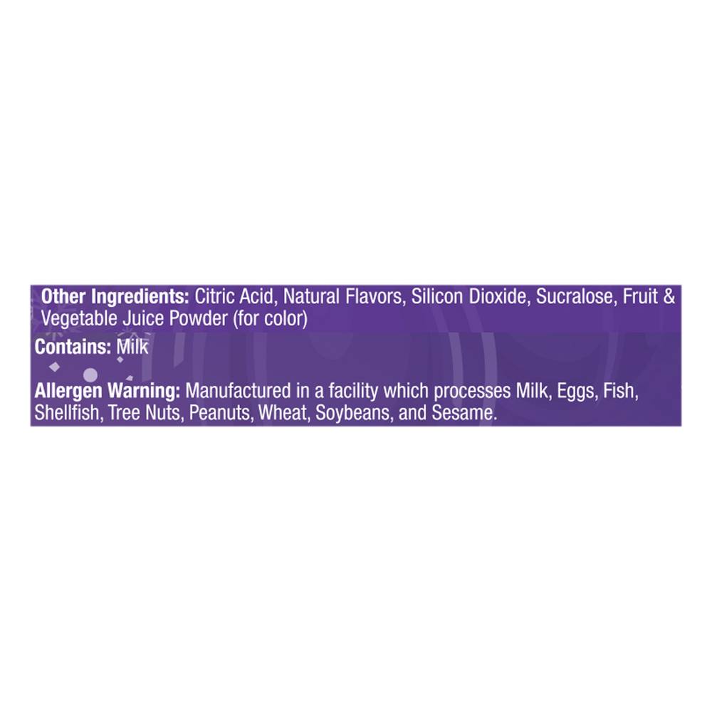 Ingredients: Other Ingredients: Citric Acid, Natural Flavors, Silicon Dioxide, Sucralose, Fruit & Vegetable Juice Powder (for Color) Contains: Milk, Milk, Eggs, Fish, Crustacean Shellfish, Molluscan Shellfish, Tree Nuts, Peanuts, Wheat, Soybeans, Sesame