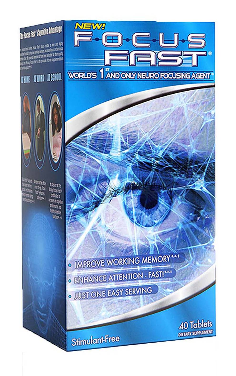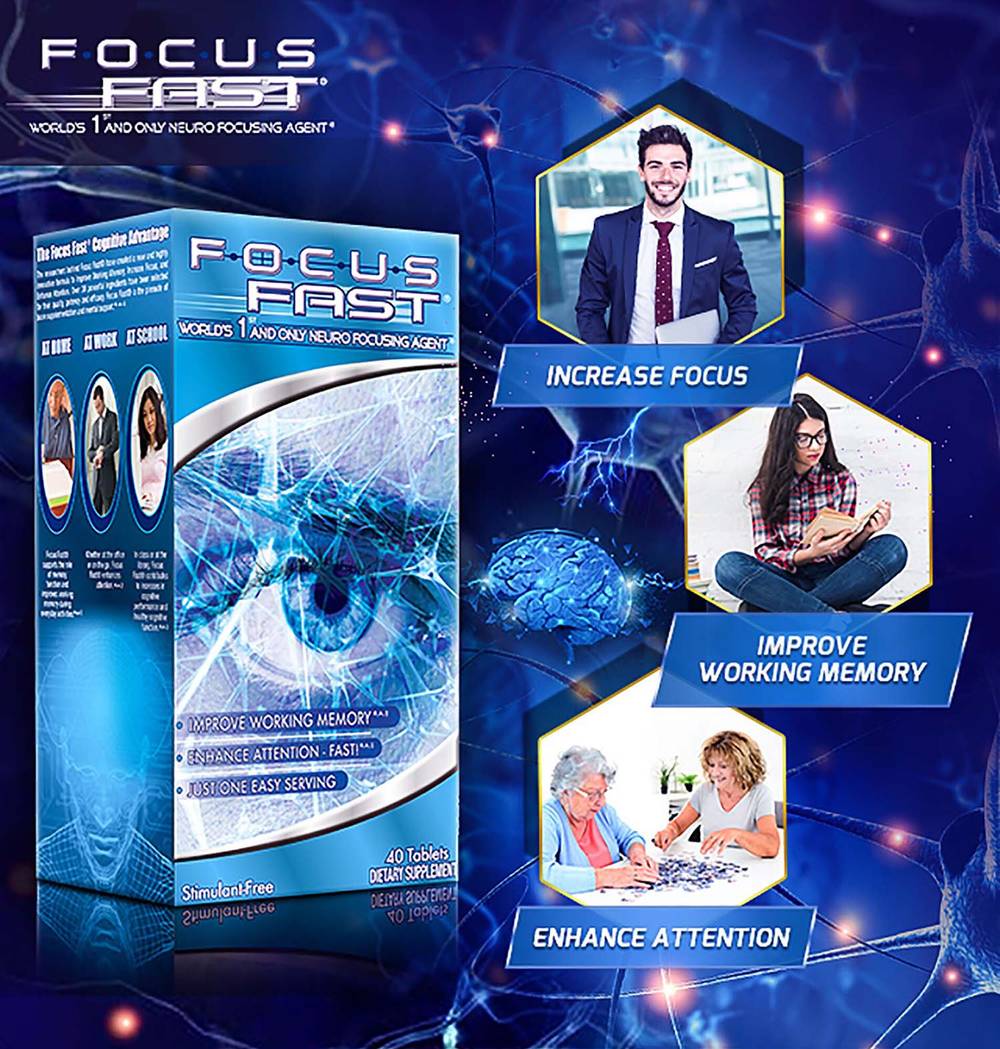 Focus Fast World's 1st and Only Neuro Focusing Agent: Improve Working Memory and Increase Focus The Researchers behind Focus Fast have created a new and highly innovative formula to improve working memory, increase focus, and enhance attention. Over 38 powerful ingredients have been selected for their quality, potency and efficacy. Focus Fast is the pinnacle of brain supplementation and mental support. How does it work? The synergistic blend of ingredients inside Focus Fast speeds up short-term memory processing through an increase in working memory neural speed and capacity. This translates into more information being reviewed, stored, and retrieved Fast By activating all available physiological pathways, Focus Fast is the only product to utilize the multi-pathway approach of Neuro Focusing Technology. In fact, in a randomized, double-blind, placebo-controlled, crossover clinical study, subjects using a key ingredient in Focus Fast improved working memory reaction time by 9.9% in only 6 hours! • At Home: Focus Fast supports the role of memory function and improves working memory during everyday activities • At Work: Whether at the office or on the go, Focus Fast enhances attention • At School: In class or at the library, Focus Fast contributes to increases in cognitive performance and healthy cognitive function • Stimulant free