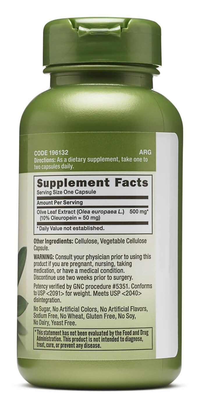Olive Leaf 500 mg - 100 Capsules (100 Servings) • EXPERTLY CRAFTED: Provides 500mg of olive leaf extract to support general well-being.* • SUPERIOR QUALITY: Vegetarian, gluten free, no soy, no wheat, no sodium, no dairy, no yeast, no artificial colors, no artificial flavor, no sugar. • TRADITIONAL ANTIOXIDANT: Derived from the olive plant, both olive leaves and the extract have been used to support a variety of conditions. A major component of olive leaf, oleuropein, has been shown to have antioxidant qualities. • HERBAL SUPPLEMENT: Support from well-being supplements powered by nature. • BACKED BY SCIENCE: Since 1935, GNC has been committed to meeting the highest standards of quality, safety, and efficacy while applying the most up-to-date advances in nutritional science so you can live well. *These statements have not been evaluated by the Food and Drug Administration. This product is not intended to diagnose, treat, cure, or prevent any disease.