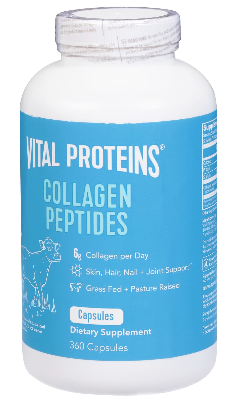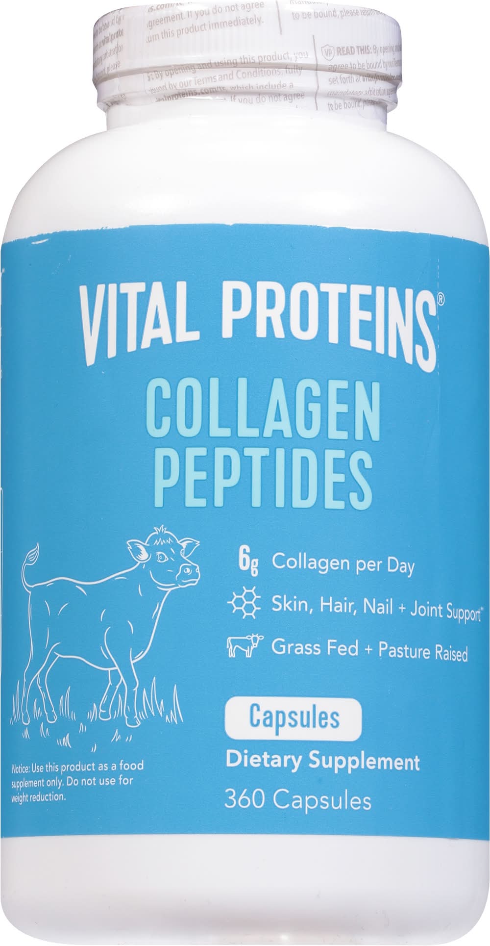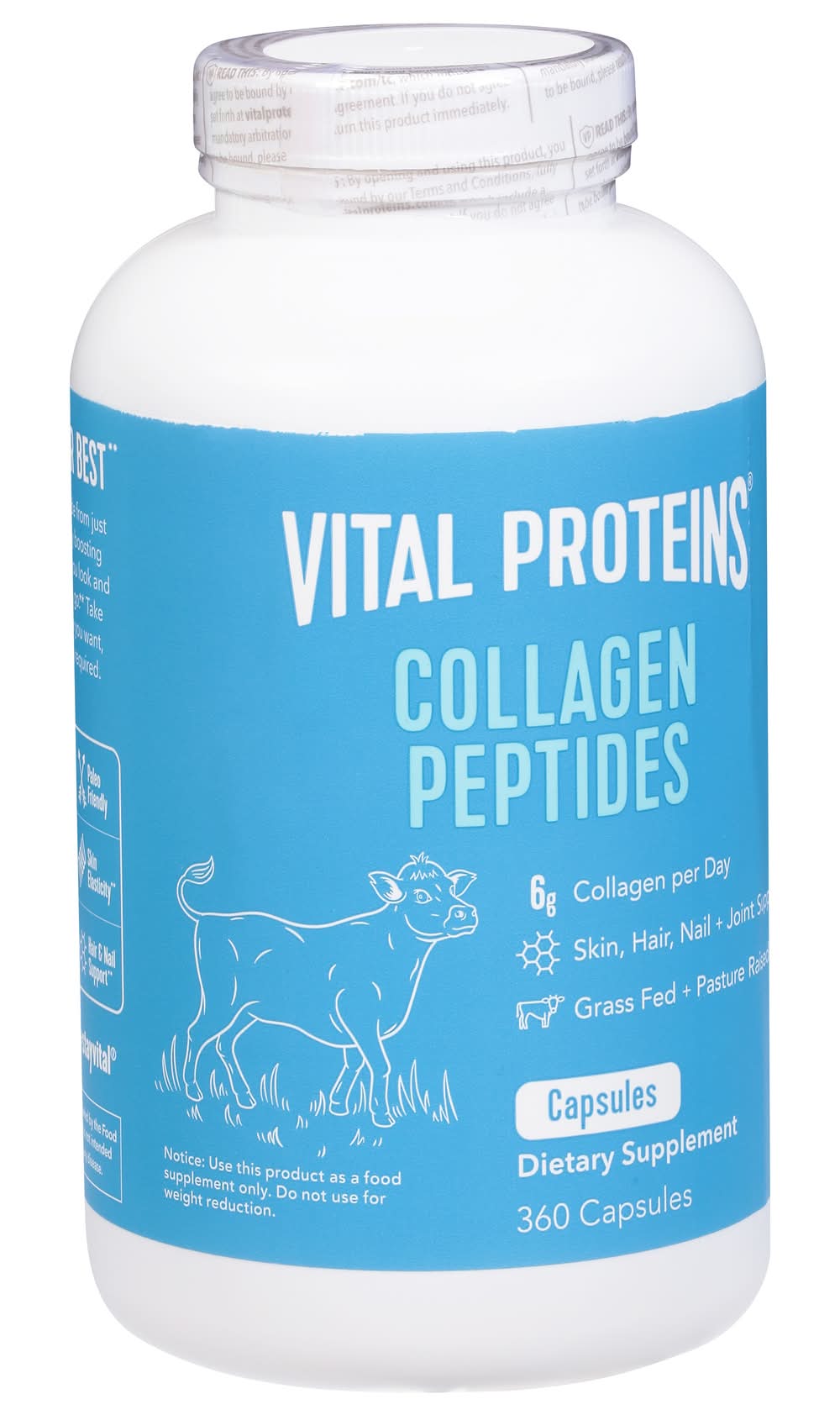 Dietary Supplement. Skin, Hair, Nail + Joint Support. 6 g collagen per day. Contains 8 of 9 Essential Amino Acids. Gluten free. Dairy free. Typical Amino Acid Profile: Amount Per Serving: Alanine 241 mg; Arginine 250 mg; Aspartic Acid 197 mg; Glutamic Acid 369 mg; Glycine 613 mg; Histidine [Essential Amino Acids] 24 mg; Hydroxylysine 36 mg; Hydroxyproline 339 mg; Isoleucine [Essential Amino Acids] 45 mg; Leucine [Essential Amino Acids] 86 mg; Lysine [Essential Amino Acids] 102 mg; Methionine [Essential Amino Acids] 17 mg; Phenylalanine [Essential Amino Acids] 62 mg; Proline 343 mg; Serine 102 mg; Threonine [Essential Amino Acids] 57 mg; Tryptophan [Essential Amino Acids] 0 mg; Tyrosine 15 mg; Valine [Essential Amino Acids] 72 mg. Grass fed + pasture raised. Look & Feel Your Best: Our Collagen Peptides is made from just one simple ingredient, easily boosting your collagen intake to help you look and feel your best wherever you go. Take them when you want, where you want, with no blending or mixing required. 6 collagen peptides; 1 simple ingredient; paleo friendly; youthful appearance; skin hydration; skin elasticity; healthy joints & bones; convenient capsule; hair & nail support. Container filled by count, not volume. Whole 30 Approved. vitalproteins.com. (hashtag)stayvital. (These statements have not been evaluated by the Food and Drug Administration. This product is not intended to diagnose, treat, cure, or prevent any disease.) Packaging: Reusable