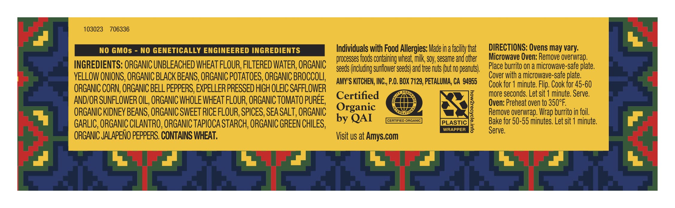 Black Bean Vegetable Burrito Amy's Kitchen, Inc., PO Box 7129, Petaluma, CA, 94955