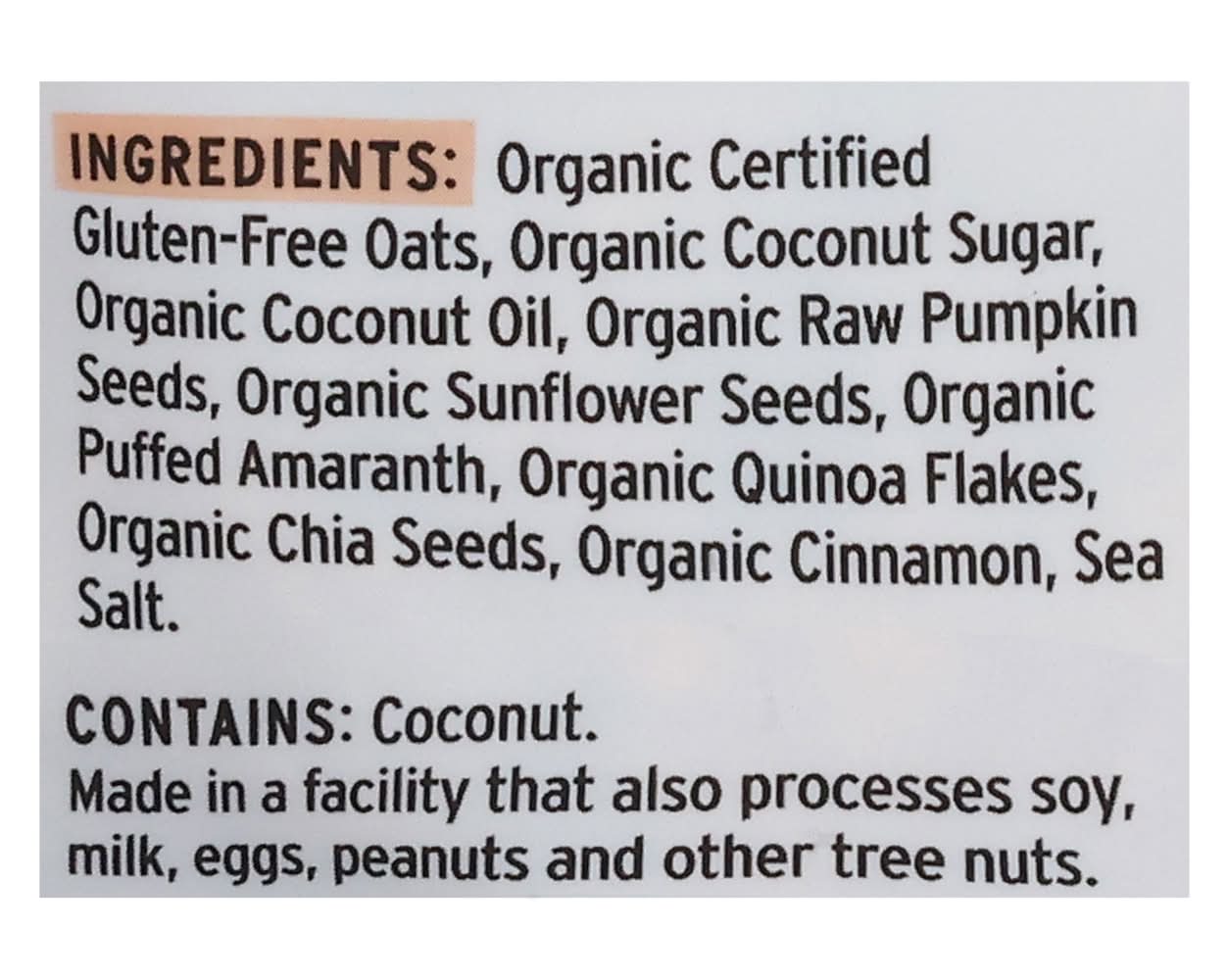 Ingredients: Organic Certified Gluten-Free Oats, Organic Coconut Sugar, Organic Coconut Oil, Organic Raw Pumpkin Seeds, Organic Sunflower Seeds, Organic Puffed Amaranth, Organic Quinoa Flakes, Organic Chia Seeds, Organic Cinnamon, Sea Salt Contains: Tree Nuts, Coconuts, Oat, Soybeans, Milk, Eggs, Peanuts, Tree Nuts