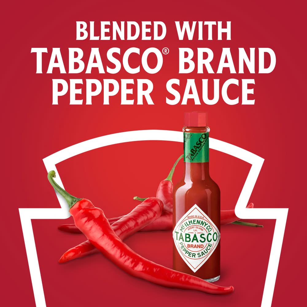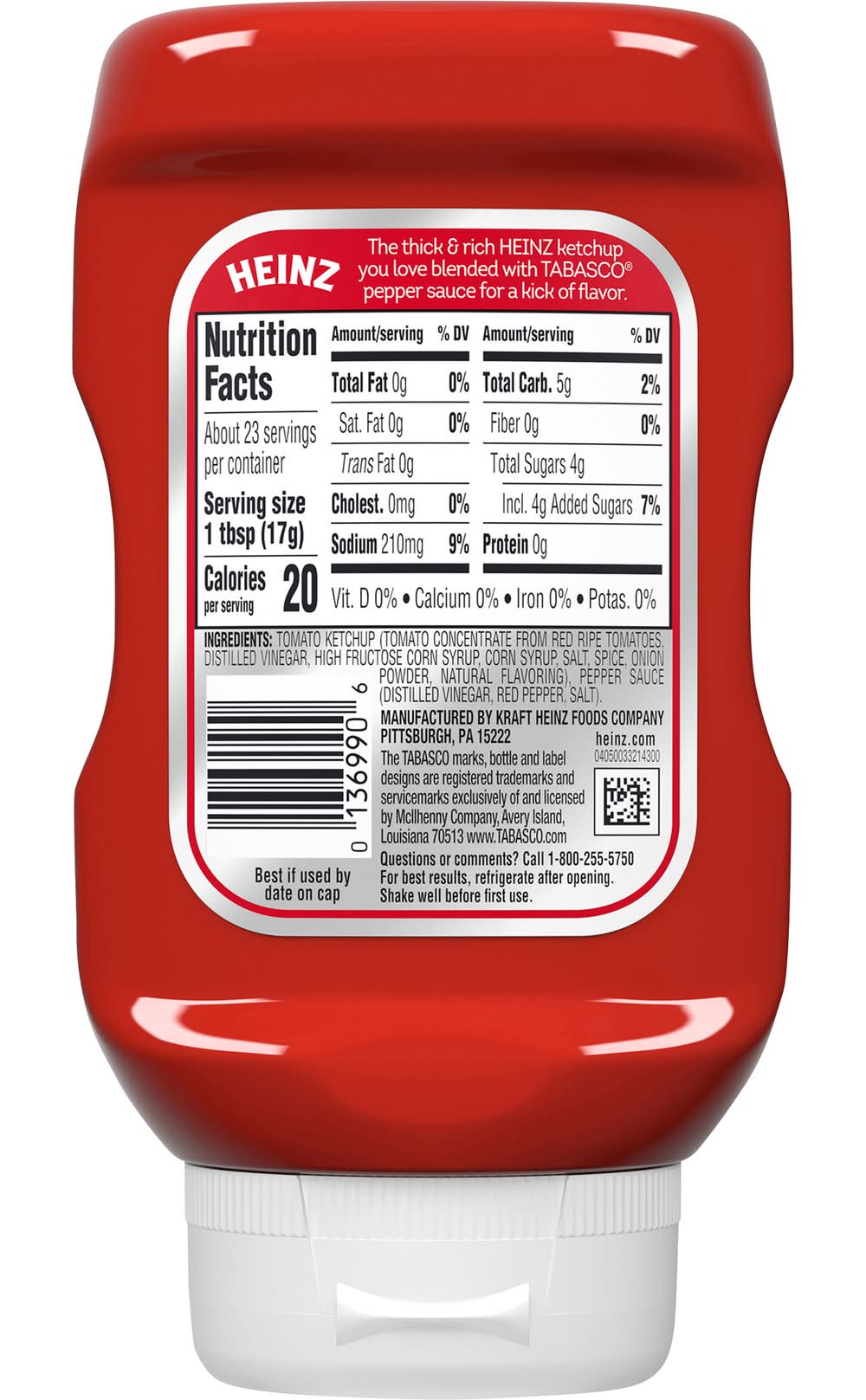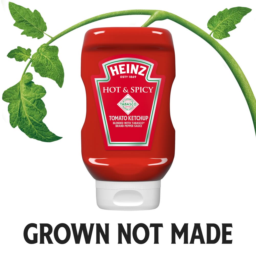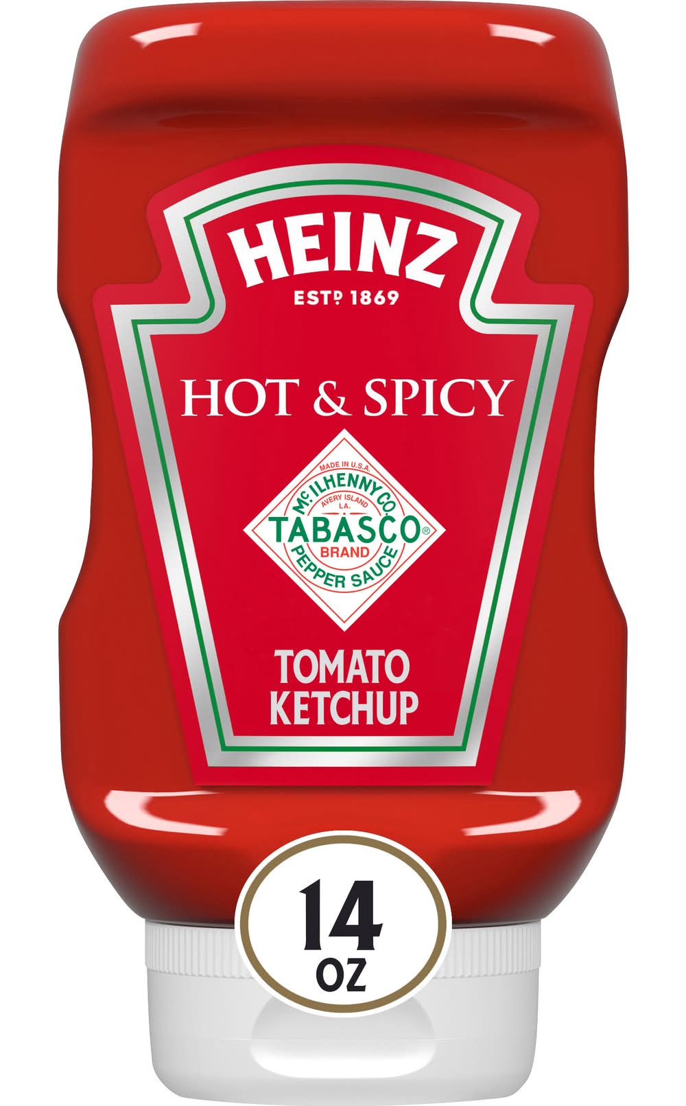 Heinz Hot and Spicy Tabasco Tomato Ketchup is the thick & rich ketchup you love blended with TABASCO® brand pepper sauce. This hot and spicy ketchup is full of home-grown Heinz taste. Use it to create the perfect hot dog or hamburger, or pair it with chicken nuggets and fries for delicious dipping. Heinz Hot and Spicy Tabasco Ketchup is packed in a 14 ounce upside down squeeze bottle with a flip cap for clean and easy serving, making it the perfect bottled ketchup for family picnics, barbecues, and camping trips. Whatever the occasion, you'll feel good serving your family Heinz Hot and Spicy Tabasco Tomato Ketchup. Kraft Heinz Foods Company, Pittsburgh, PA, 15222