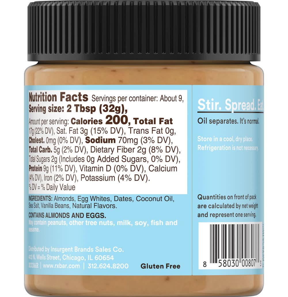 You know when you bake cookies and your whole house smells like a sweet, sugary delight? That's this, but as a nutritious nut butter spread. By adding egg whites for protein, dates for sweetness, and smooth vanilla bean, we made almond butter better. RX Nut Butter is a good source of protein (9g protein, 10% daily value), and is gluten free. Perfect as a snack topper, delicious nut butter spread, or on its own and straight out of the jar; Enjoy wholesome goodness worth snacking on. On your way to the gym, in the office or paired with fruit, toast, smoothies, or protein shakes, improve your daily routine with RX Nut Butter Vanilla almond butter. • Flavor: Vanilla almond • Chicago Bar Company LLC, 412 N. Wells Street, Chicago, IL, 60654 • Packaging: Reusable
