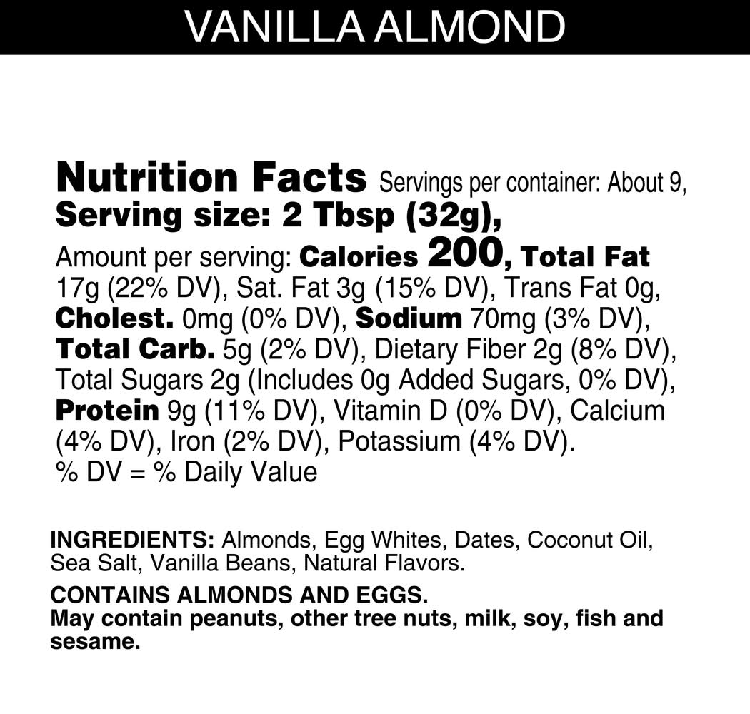 Ingredients: Almonds, Egg Whites, Dates, Coconut Oil, Sea Salt, Natural Vanilla Flavor, Vanilla Beans, Natural Flavors. Contains: Contains: almonds & eggs may contain: milk, eggs, fish, crustaceans, tree nuts, peanuts, wheat and soy.
