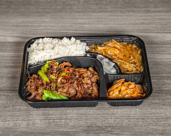 Marinated beef in a sweet and savory Korean-inspired sauce, served with a side of rice.